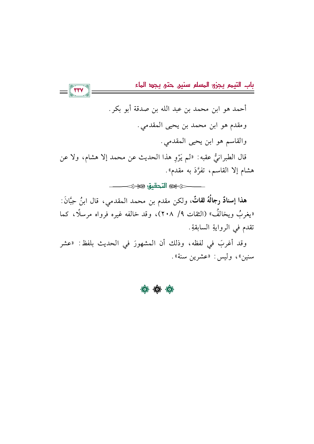 قال الطبرانيُّ عقبه: "لم يَرْوِ هذا الحديث عن محمد إلا هشام، ولا عن هشام إلا القاسم، تفرَّدَ به مقدم".
