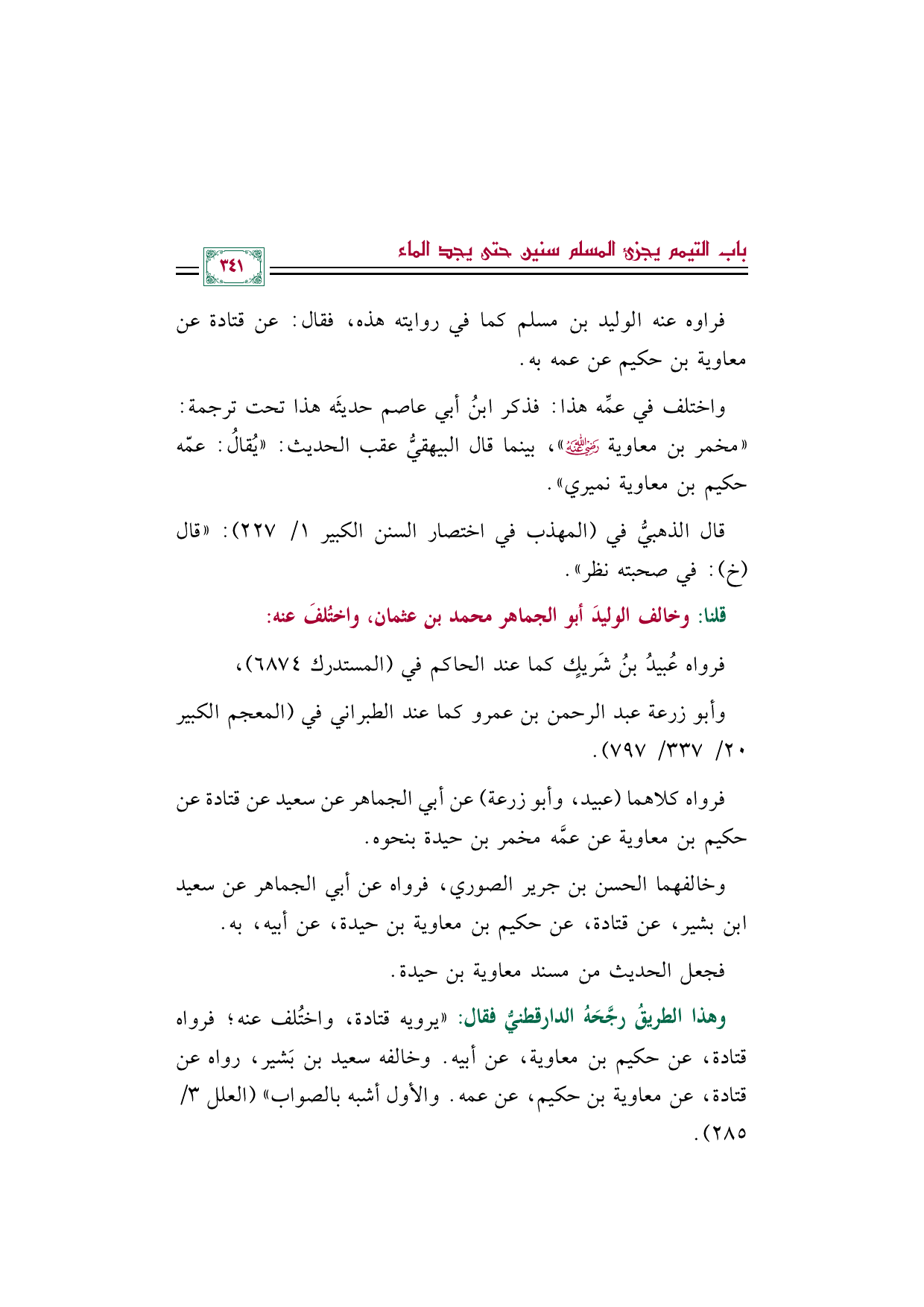 وهذا الطريقُ رجَّحَهُ الدارقطنيُّ فقال: "يرويه قتادة، واختُلف عنه؛ فرواه قتادة، عن حكيم بن معاوية، عن أبيه. وخالفه سعيد بن بَشير، رواه عن قتادة، عن معاوية بن حكيم، عن عمه. والأول أشبه بالصواب" (العلل ٣/ ٢٨٥).