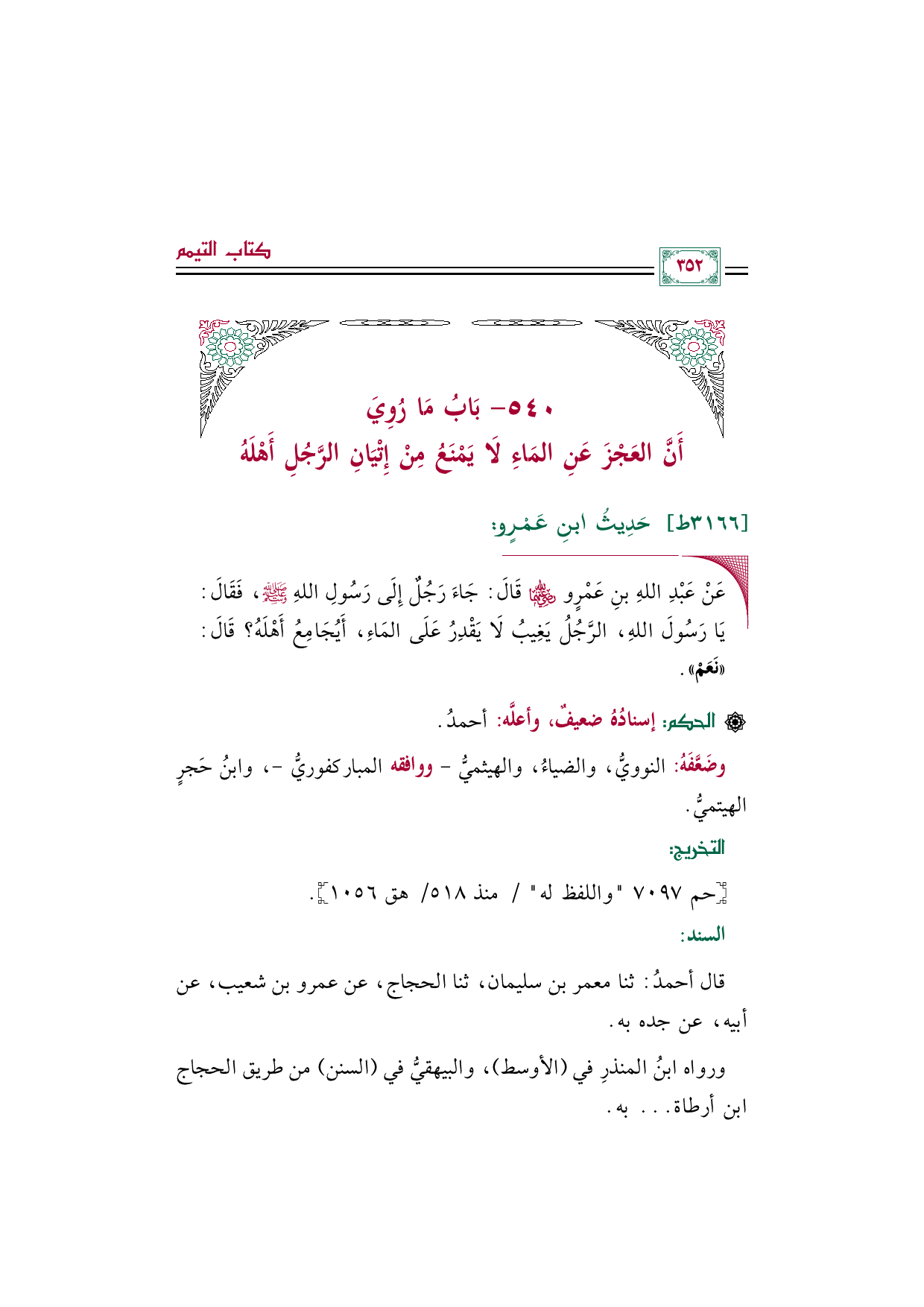 ◼ عَنْ عَبْدِ اللهِ بنِ عَمْرٍو رضي الله عنهما قَالَ: جَاءَ رَجُلٌ إِلَى رَسُولِ اللهِ صلى الله عليه وسلم، فَقَالَ: يَا رَسُولَ اللهِ، الرَّجُلُ يَغِيبُ لَا يَقْدِرُ عَلَى المَاءِ، أَيُجَامِعُ أَهْلَهُ؟ قَالَ: ((نَعَمْ)).
