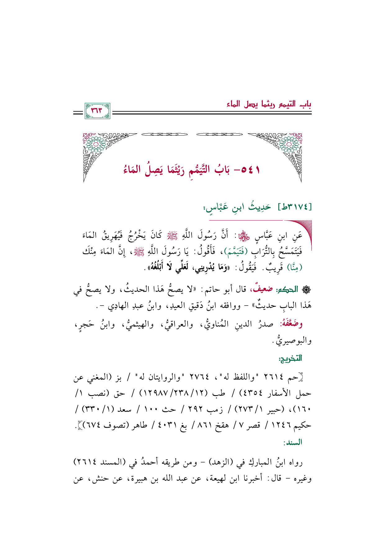 ◼ عَنِ ابنِ عَبَّاسٍ رضي الله عنهما: أَنَّ رَسُولَ اللَّهِ صلى الله عليه وسلم كَانَ يَخْرُجُ فَيُهَرِيقُ المَاءَ فَيَتَمَسَّحُ بِالتُّرَابِ (فَتَيَمَّمَ)، فَأَقُولُ: يَا رَسُولَ اللَّهِ صلى الله عليه وسلم، إِنَّ المَاءَ مِنْكَ (مِنَّا) قَرِيبٌ. فَيَقُولُ: ((وَمَا يُدْرِينِي، لَعَلِّي لَا أَبْلُغُهُ)).