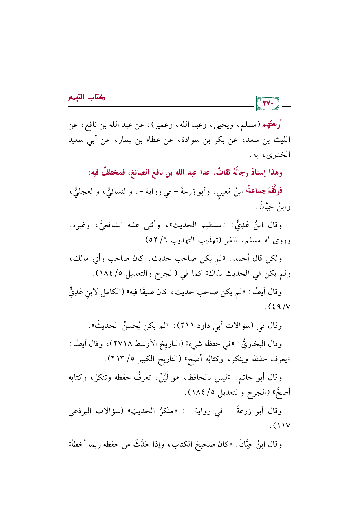 وهذا إسنادٌ رجالُهُ ثقاتٌ، عدا عبد الله بن نافع الصائغ، فمختلفٌ فيه: