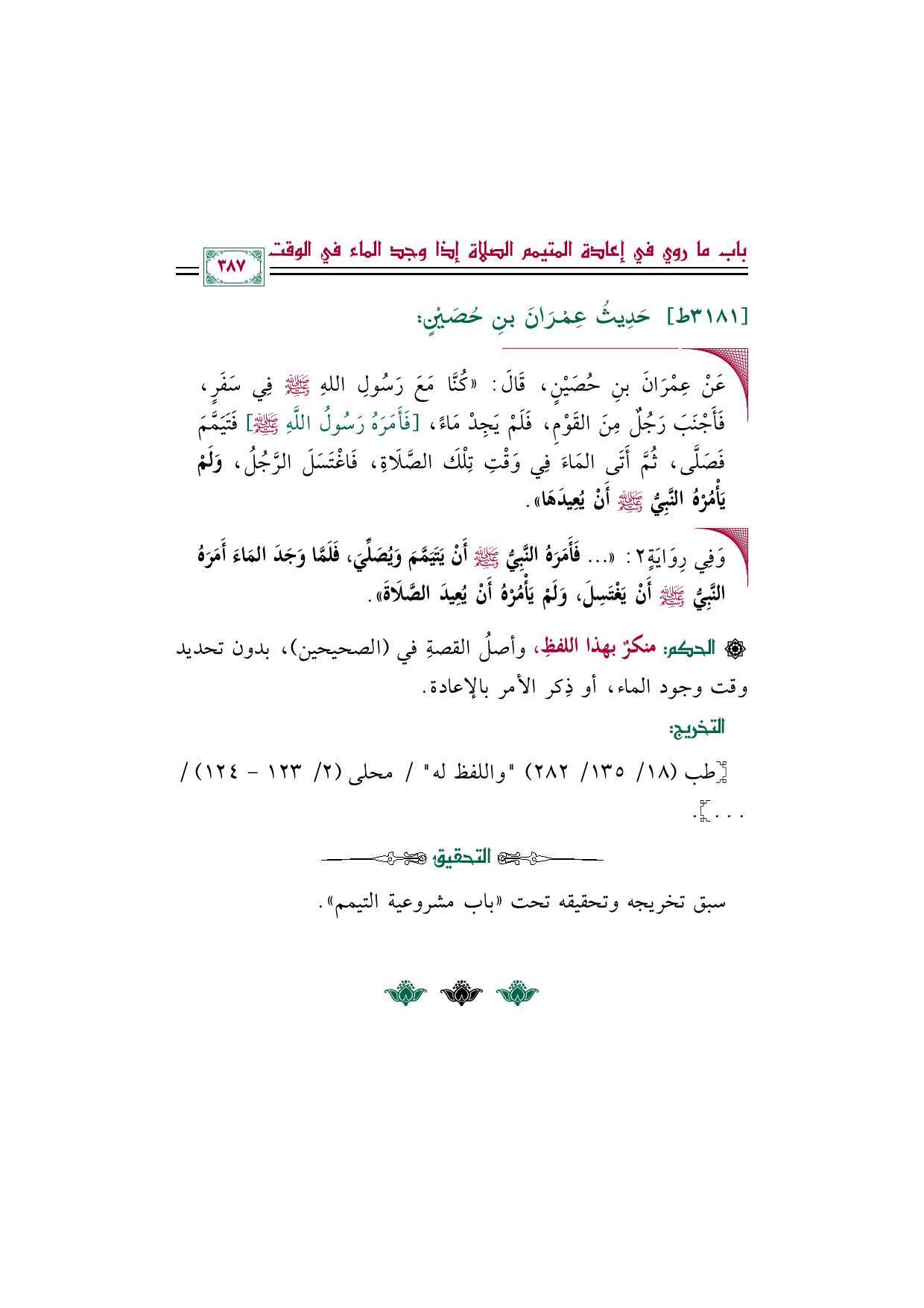 ◼ عَنْ عِمْرَانَ بنِ حُصَيْنٍ، قَالَ: ((كُنَّا مَعَ رَسُولِ اللهِ صلى الله عليه وسلم فِي سَفَرٍ، فَأَجْنَبَ رَجُلٌ مِنَ القَوْمِ، فَلَمْ يَجِدْ مَاءً، [فَأَمَرَهُ رَسُولُ اللَّهِ صلى الله عليه وسلم] فَتَيَمَّمَ فَصَلَّى، ثُمَّ أَتَى المَاءَ فِي وَقْتِ تِلْكَ الصَّلَاةِ، فَاغْتَسَلَ الرَّجُلُ، وَلَمْ يَأْمُرْهُ النَّبِيُّ صلى الله عليه وسلم أَنْ يُعِيدَهَا)).