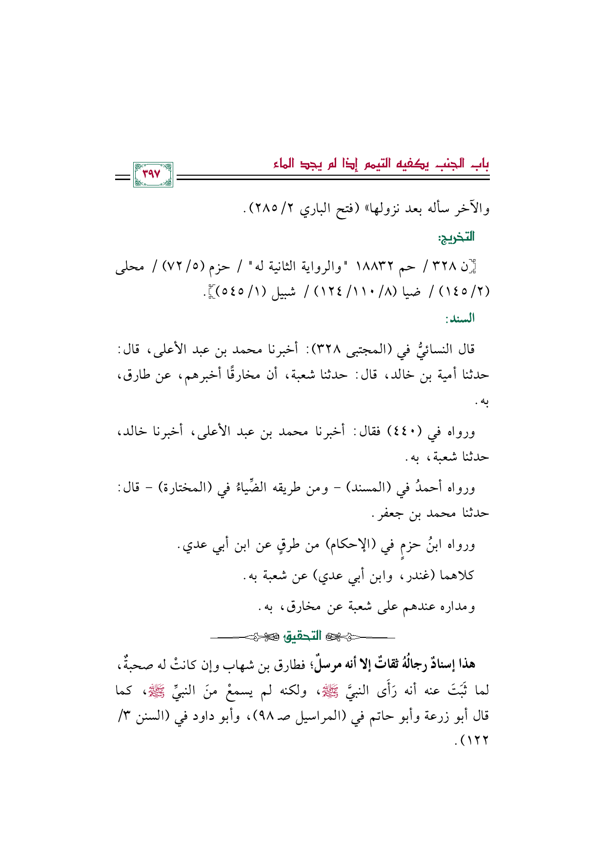 قال النسائيُّ في (المجتبى ٣٢٨): أخبرنا محمد بن عبد الأعلى، قال: حدثنا أمية بن خالد، قال: حدثنا شعبة، أن مخارقًا أخبرهم، عن طارق، به.