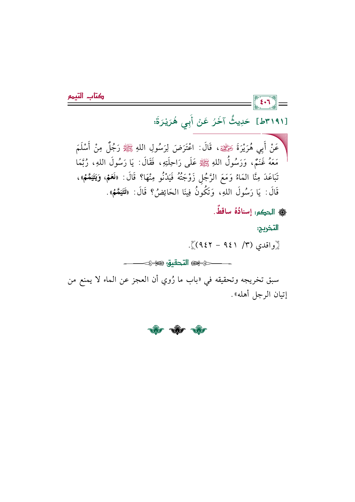 ◼ عَنْ أَبِي هُرَيْرَةَ رضي الله عنه، قَالَ: اعْتَرَضَ لِرَسُولِ اللهِ صلى الله عليه وسلم رَجُلٌ مِنْ أَسْلَمَ مَعَهُ غَنَمٌ، وَرَسُولُ اللهِ صلى الله عليه وسلم عَلَى رَاحِلَتِهِ، فَقَالَ: يَا رَسُولَ اللهِ، رُبَّمَا تَبَاعَدَ مِنَّا المَاءُ وَمَعَ الرَّجُلِ زَوْجَتُهُ فَيَدْنُو مِنْهَا؟ قَالَ: ((نَعَمْ، وَيَتَيَمَّمُ))، قَالَ: يَا رَسُولَ اللهِ، وَتَكُونُ فِينَا الحَائِضُ؟ قَالَ: ((تَتَيَمَّمُ)).