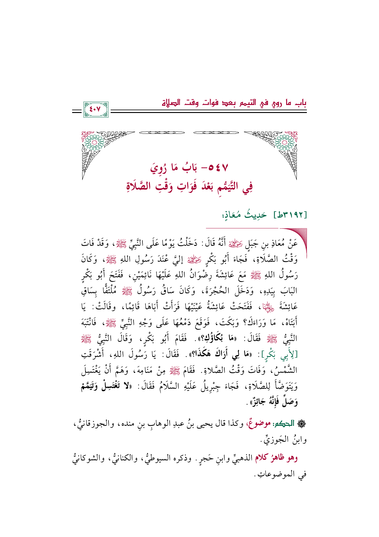◼ عَنْ مُعَاذِ بنِ جَبَلٍ رضي الله عنه أَنَّهُ قَالَ: دَخَلْتُ يَوْمًا عَلَى النَّبِيِّ صلى الله عليه وسلم، وَقَدْ فَاتَ وَقْتُ الصَّلَاةِ، فَجَاءَ أَبُو بَكْرٍ رضي الله عنه إليَّ عْنَدَ رَسُولِ اللهِ صلى الله عليه وسلم، وَكَانَ رَسُولُ اللهِ صلى الله عليه وسلم مَعَ عَائِشَةَ رِضْوَانُ اللهِ عَلَيْهَا نَائِمَيْنِ، فَفَتَحَ أَبُو بَكْرٍ البَابَ بِيَدِهِ، وَدَخَلَ الحُجْرَةَ، وَكَانَ سَاقُ رَسُولُ صلى الله عليه وسلم مُلْتَفًّا بِسَاقِ عَائِشَةَ رضي الله عنها، فَفَتَحَتْ عَائِشَةُ عَيْنَيْهَا فَرَأَتْ أَبَاهَا قَائِمًا، وقَالَتْ: يَا أَبَتَاهْ، مَا وَرَاءَكَ؟ وَبَكَتَ، فَوَقَعَ دَمْعُهَا عَلَى وَجْهِ النَّبِيِّ صلى الله عليه وسلم، فَانْتَبَهَ النَّبِيُّ صلى الله عليه وسلم فَقَالَ: ((مَا بُكَاؤُكِ؟ )). فَقَامَ أَبُو بَكْرٍ، وَقَالَ النَّبِيُّ صلى الله عليه وسلم [لِأَبِي بَكْرٍ]: ((مَا لِي أَرَاكَ هَكَذَا؟ )). فَقَالَ: يَا رَسُولَ اللهِ، أَشْرَقَتِ الشَّمْسُ، وَفَاتَ وَقْتُ الصَّلاةِ. فَقَامَ صلى الله عليه وسلم مِنْ مَنَامِهَ، وَهَمَّ أَنْ يَغْتَسِلَ وَيَتَوَضَّأَ لِلصَّلَاةِ، فَجَاءَ جِبْرِيلُ عَلَيْهِ السَّلَامُ فَقَالَ: ((لا تَغْتَسِلْ وَتَيَمَّمْ وَصَلِّ فَإِنَّهُ جَائِزٌ)).