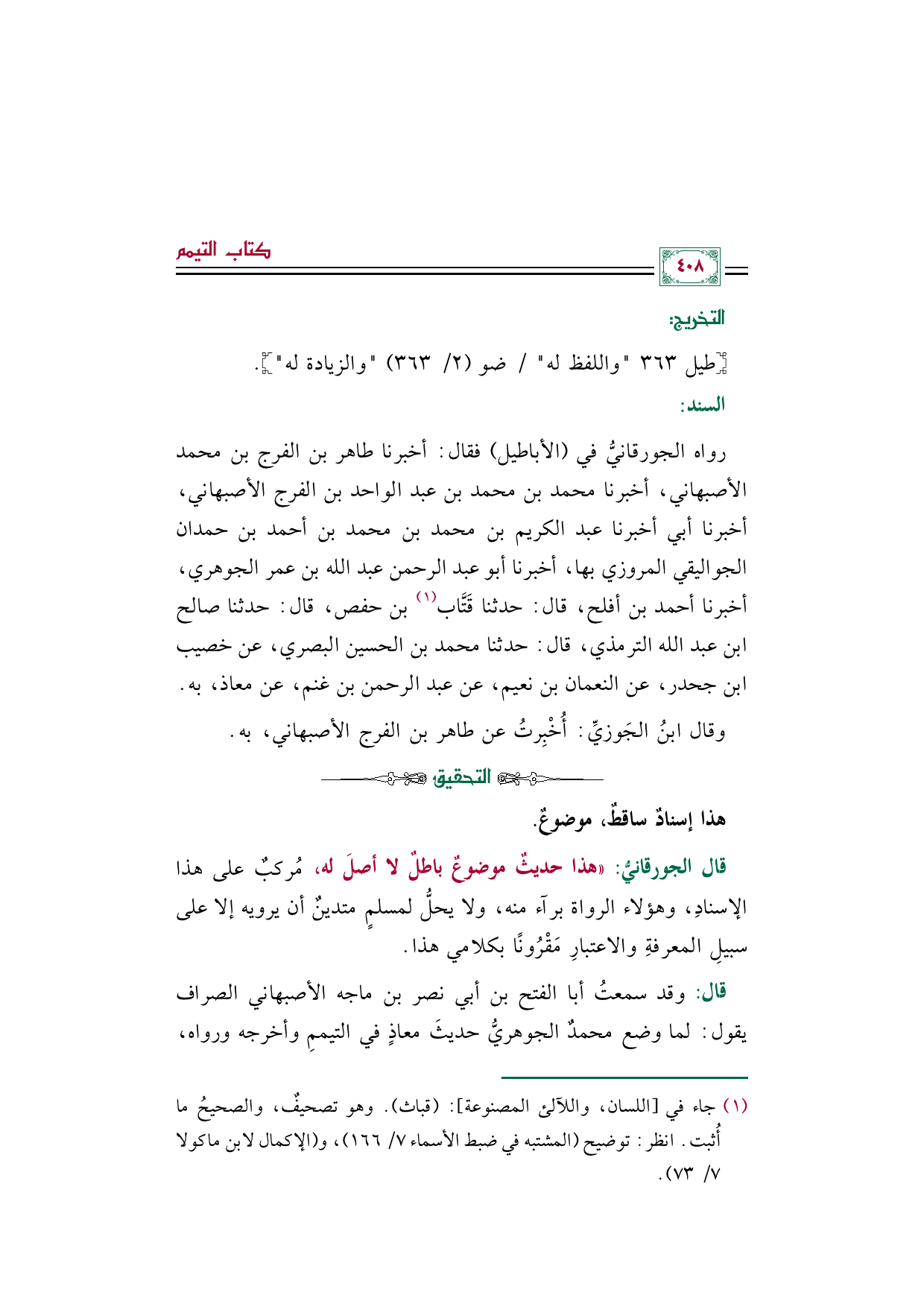 رواه الجورقانيُّ في (الأباطيل) فقال: أخبرنا طاهر بن الفرج بن محمد الأصبهاني، أخبرنا محمد بن محمد بن عبد الواحد بن الفرج الأصبهاني، أخبرنا أبي أخبرنا عبد الكريم بن محمد بن محمد بن أحمد بن حمدان الجواليقي المروزي بها، أخبرنا أبو عبد الرحمن عبد الله بن عمر الجوهري، أخبرنا أحمد بن أفلح، قال: حدثنا قَتَّاب (¬١) بن حفص، قال: حدثنا صالح بن عبد الله الترمذي، قال: حدثنا محمد بن الحسين البصري، عن خصيب بن جحدر، عن النعمان بن نعيم، عن عبد الرحمن بن غنم، عن معاذ، به.