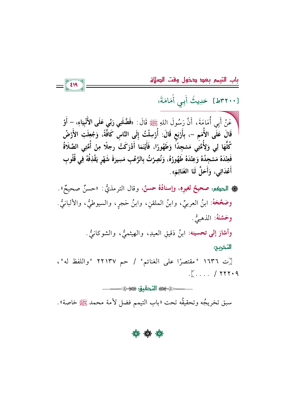 ◼ عَنْ أَبِي أُمَامَةَ، أَنَّ رَسُولَ اللهِ صلى الله عليه وسلم قَالَ: ((فَضَّلَنِي رَبِّي عَلَى الأَنْبِيَاءِ، -أَوْ قَالَ عَلَى الأُمَمِ-، بِأَرْبَعٍ قَالَ: أُرْسِلْتُ إِلَى النَّاسِ كَافَّةً، وَجُعِلَتِ الأَرْضُ كُلُّهَا لِي وَلِأُمَّتِي مَسْجِدًا وَطَهُورًا، فَأَيْنَمَا أَدْرَكَتْ رجلًا مِنْ أُمَّتِي الصَّلَاةُ فَعِنْدَهُ مَسْجِدُهُ وَعِنْدَهُ طَهُورُهُ، وَنُصِرْتُ بِالرُّعْبِ مَسِيرَةَ شَهْرٍ يَقْذِفُهُ فِي قُلُوبِ أَعْدَائِي، وَأَحَلَّ لَنَا الغَنَائِمَ)).