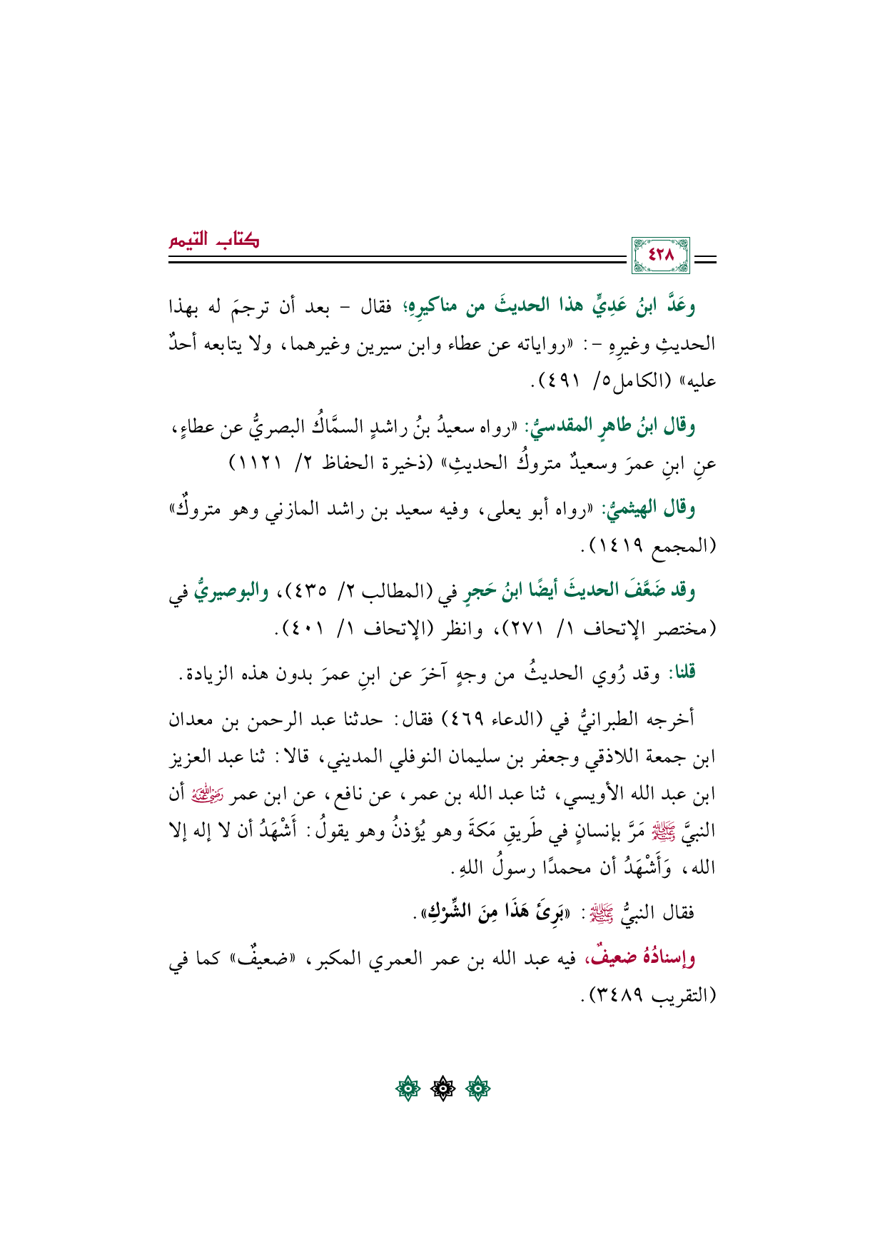 وقال ابنُ طاهرٍ المقدسيُّ: "رواه سعيدُ بنُ راشدٍ السمَّاكُ البصريُّ عن عطاءٍ، عنِ ابنِ عمرَ وسعيدٌ متروكُ الحديثِ" (ذخيرة الحفاظ ٢/ ١١٢١)