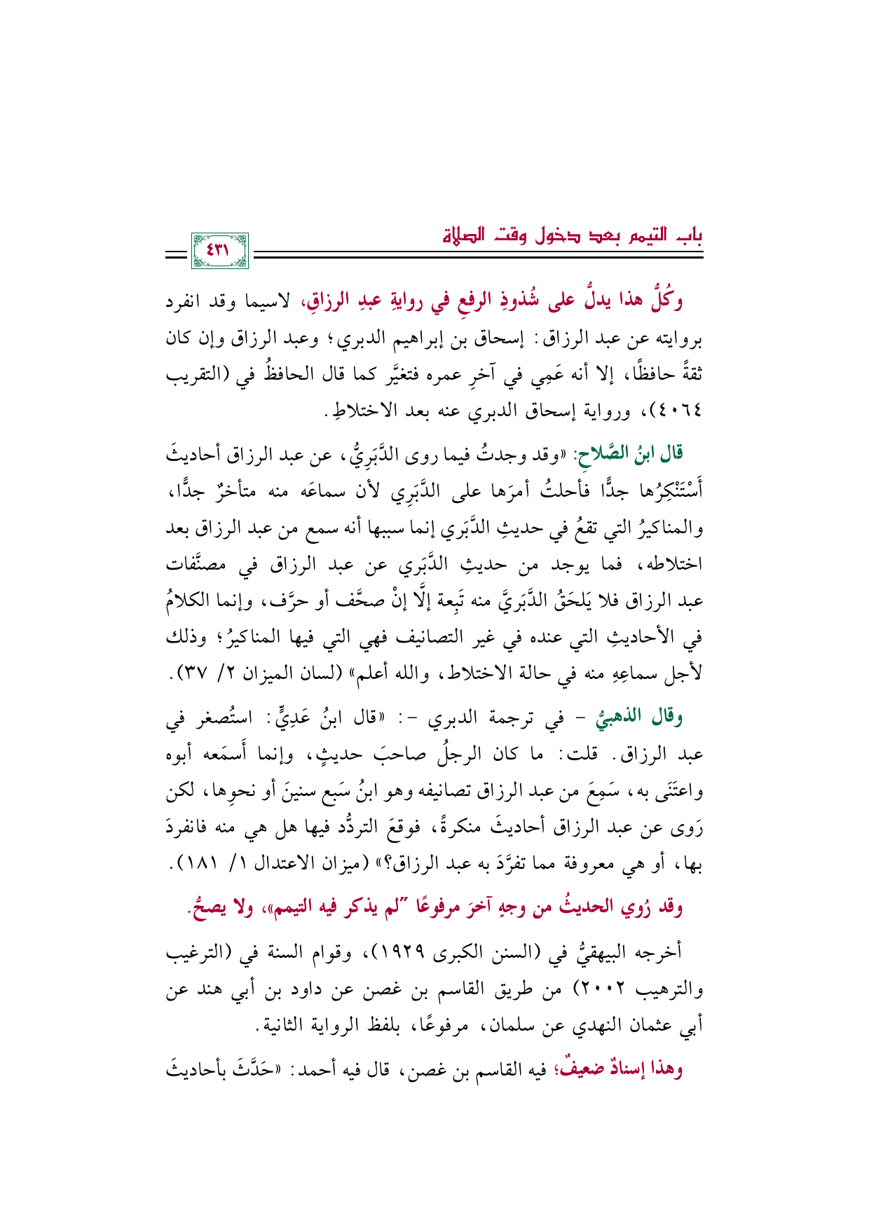 وكُلُّ هذا يدلُّ على شُذوذِ الرفعِ في روايةِ عبدِ الرزاقِ، لاسيما وقد انفرد بروايته عن عبد الرزاق: إسحاق بن إبراهيم الدبري؛ وعبد الرزاق وإن كان ثقةً حافظًا، إلا أنه عَمِي في آخرِ عمره فتغيَّر كما قال الحافظُ في (التقريب ٤٠٦٤)، ورواية إسحاق الدبري عنه بعد الاختلاطِ.