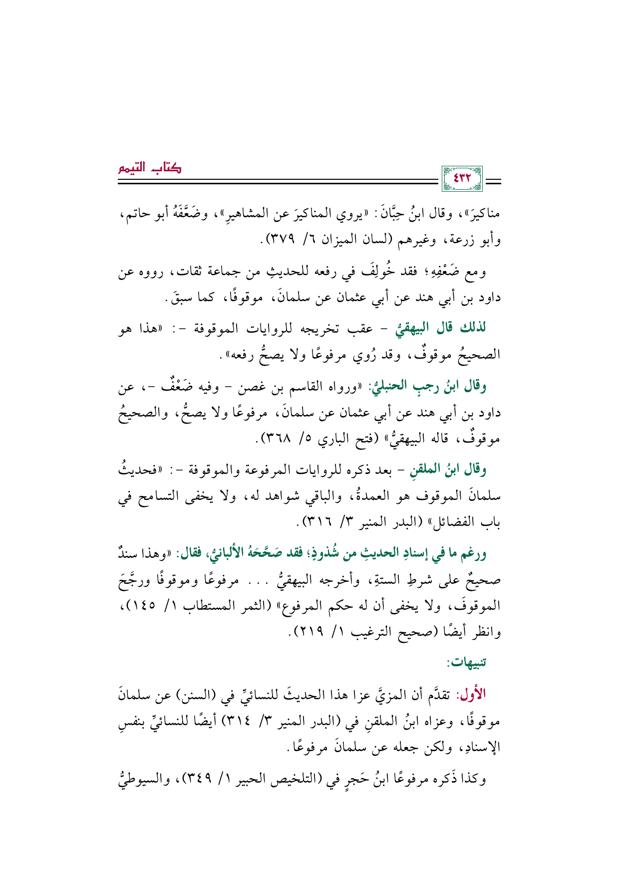 وقال ابنُ الملقنِ -بعد ذكره للروايات المرفوعة والموقوفة-: "فحديثُ سلمانَ الموقوف هو العمدةُ، والباقي شواهد له، ولا يخفى التسامح في باب الفضائل" (البدر المنير ٣/ ٣١٦).