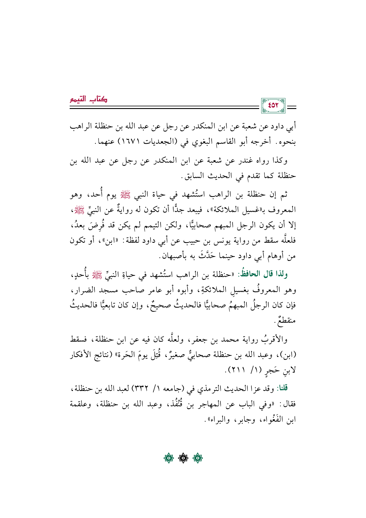 والأقربُ رواية محمد بن جعفر، ولعلَّه كان فيه عن ابن حنظلة، فسقط (ابن)، وعبد الله بن حنظلة صحابيٌّ صغيرٌ، قُتِلَ يومَ الحَرة" (نتائج الأفكار لابنِ حَجرٍ (١/ ٢١١).