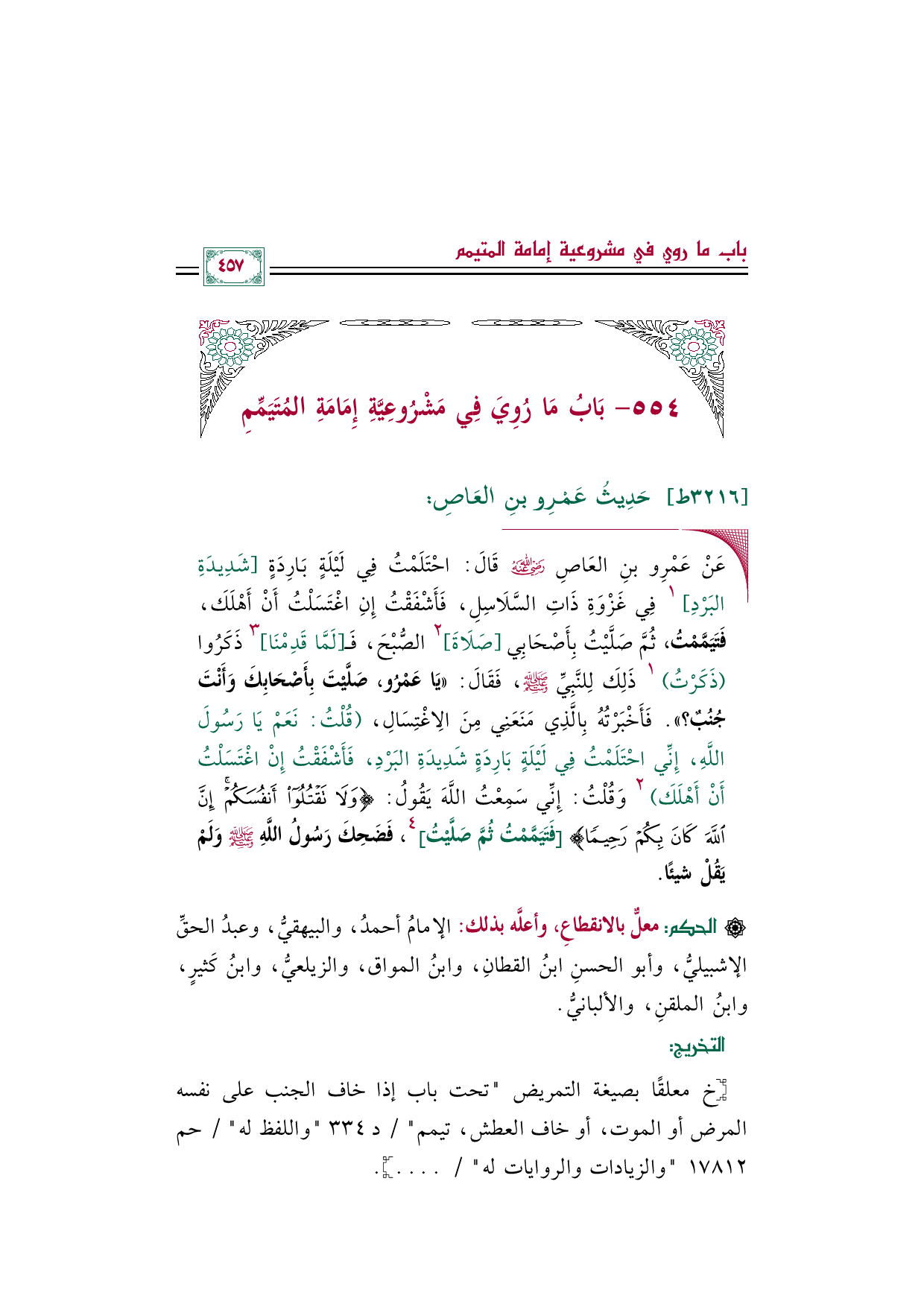 ◼ عَنْ عَمْرِو بنِ العَاصِ رضي الله عنه قَالَ: احْتَلَمْتُ فِي لَيْلَةٍ بَارِدَةٍ [شَدِيدَةِ البَرْدِ] ١ فِي غَزْوَةِ ذَاتِ السَّلَاسِلِ، فَأَشْفَقْتُ إِنِ اغْتَسَلْتُ أَنْ أَهْلَكَ، فَتَيَمَّمْتُ، ثُمَّ صَلَّيْتُ بِأَصْحَابِي [صَلَاةَ] ٢ الصُّبْحَ، فَـ[لَمَّا قَدِمْنَا] ٣ ذَكَرُوا (ذَكَرْتُ) ١ ذَلِكَ لِلنَّبِيِّ صلى الله عليه وسلم، فَقَالَ: ((يَا عَمْرُو، صَلَّيْتَ بِأَصْحَابِكَ وَأَنْتَ جُنُبٌ؟ )). فَأَخْبَرْتُهُ بِالَّذِي مَنَعَنِي مِنَ الِاغْتِسَالِ، (قُلْتُ: نَعَمْ يَا رَسُولَ اللَّهِ، إِنِّي احْتَلَمْتُ فِي لَيْلَةٍ بَارِدَةٍ شَدِيدَةِ البَرْدِ، فَأَشْفَقْتُ إِنْ اغْتَسَلْتُ أَنْ أَهْلَكَ) ٢ وَقُلْتُ: إِنِّي سَمِعْتُ اللَّهَ يَقُولُ: {وَلَا تَقْتُلُوا أَنْفُسَكُمْ إِنَّ اللَّهَ كَانَ بِكُمْ رَحِيمًا} [فَتَيَمَّمْتُ ثُمَّ صَلَّيْتُ] ٤، فَضَحِكَ رَسُولُ اللَّهِ صلى الله عليه وسلم وَلَمْ يَقُلْ شيئًا.