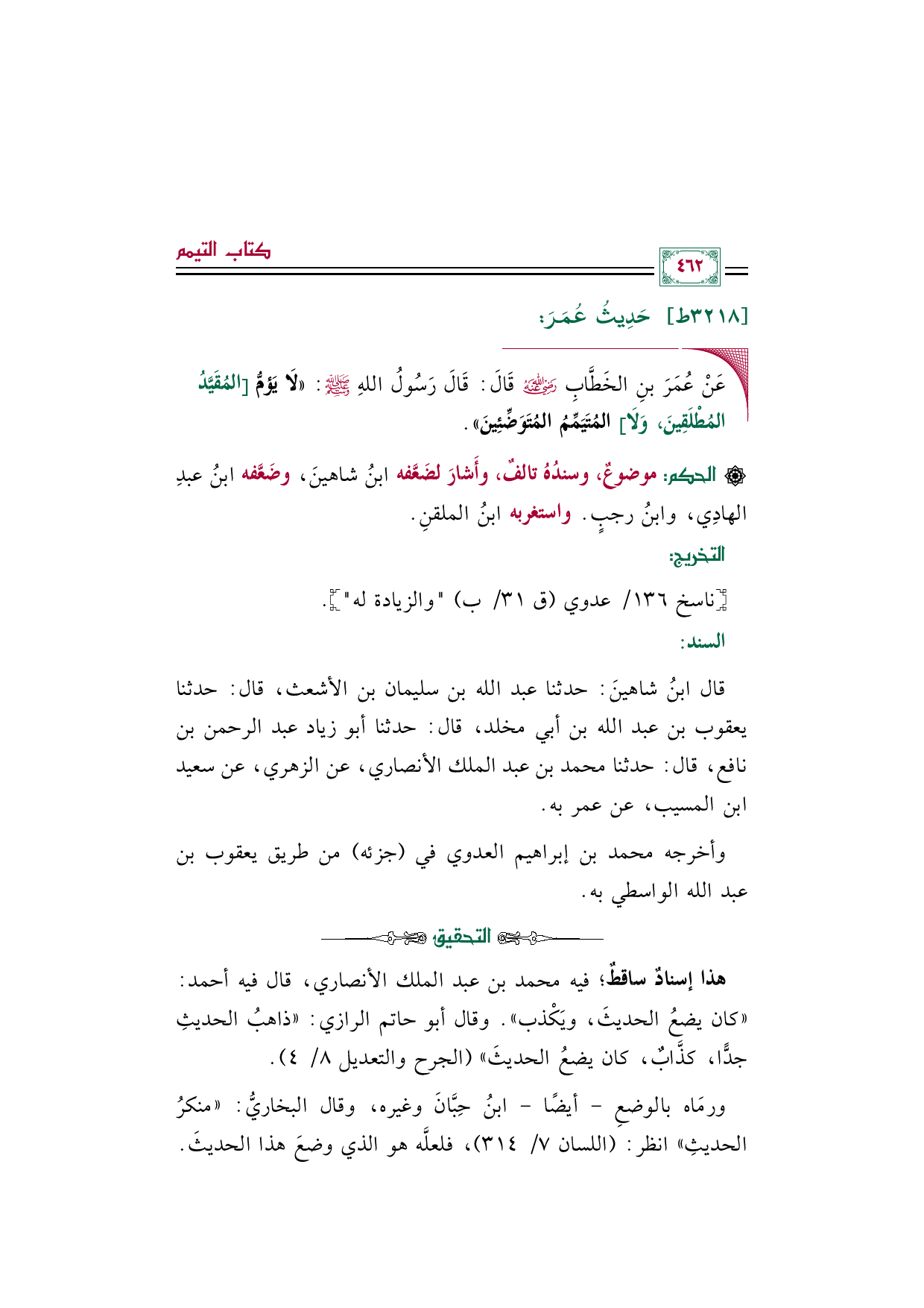 قال ابنُ شاهينَ: حدثنا عبد الله بن سليمان بن الأشعث، قال: حدثنا يعقوب بن عبد الله بن أبي مخلد، قال: حدثنا أبو زياد عبد الرحمن بن نافع، قال: حدثنا محمد بن عبد الملك الأنصاري، عن الزهري، عن سعيد بن المسيب، عن عمر به.