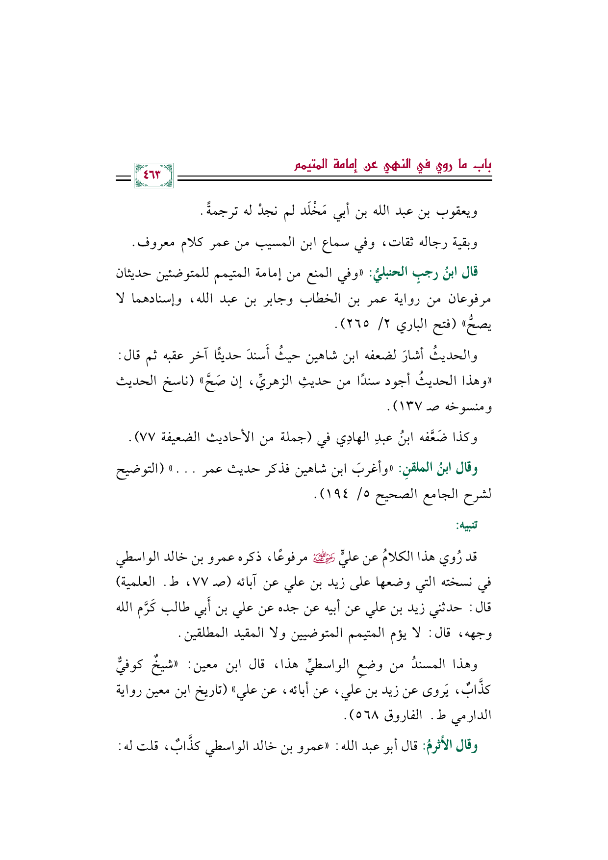 قال ابنُ رجبٍ الحنبليُّ: "وفي المنع من إمامة المتيمم للمتوضئين حديثان مرفوعان من رواية عمر بن الخطاب وجابر بن عبد الله، وإسنادهما لا يصحُّ" (فتح الباري ٢/ ٢٦٥).