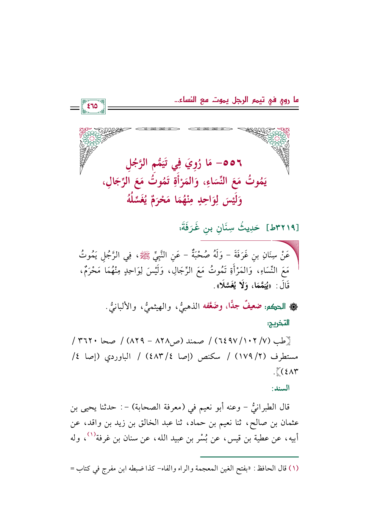 قال الطبرانيُّ -وعنه أبو نعيم في (معرفة الصحابة) -: حدثنا يحيى بن عثمان بن صالح، ثنا نعيم بن حماد، ثنا عبد الخالق بن زيد بن واقد، عن أبيه، عن عطية بن قيس، عن بُسْر بن عبيد الله، عن سنان بن غرفة (¬١)، وله