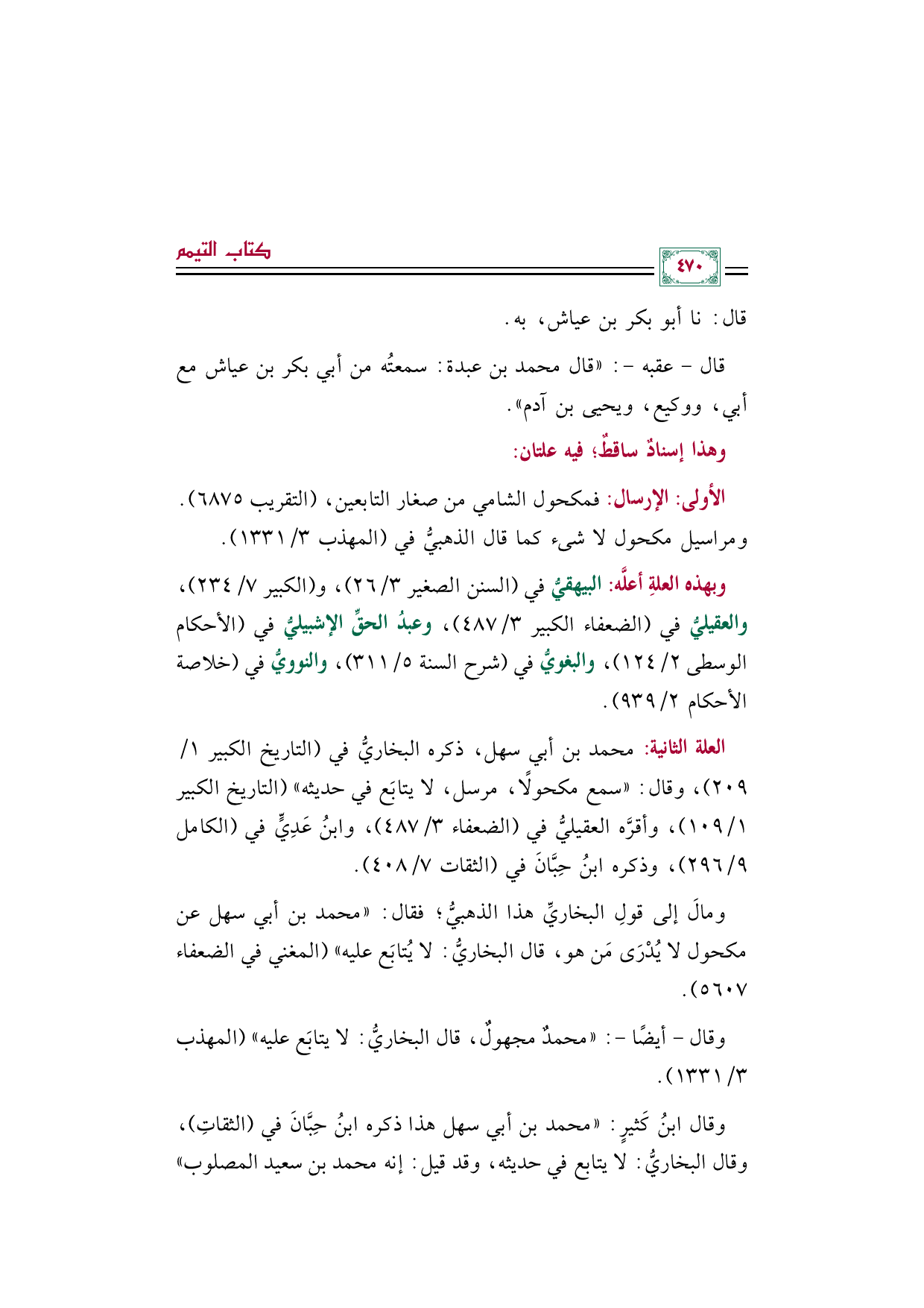 العلة الثانية: محمد بن أبي سهل، ذكره البخاريُّ في (التاريخ الكبير ١/ ٢٠٩)، وقال: "سمع مكحولًا، مرسل، لا يتابَع في حديثه" (التاريخ الكبير ١/ ١٠٩)، وأقرَّه العقيليُّ في (الضعفاء ٣/ ٤٨٧)، وابنُ عَدِيٍّ في (الكامل ٩/ ٢٩٦)، وذكره ابنُ حِبَّانَ في (الثقات ٧/ ٤٠٨).
