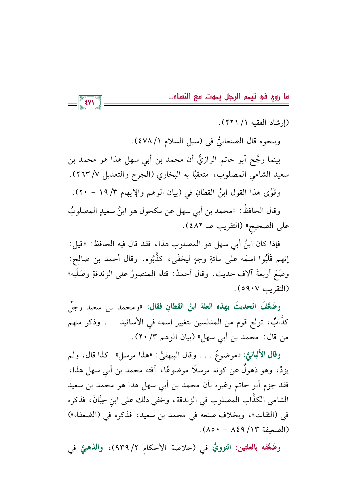 وضَعَّفَ الحديثَ بهذه العلة ابنُ القطانِ فقال: "ومحمد بن سعيد رجلٌ كذَّابٌ، تولع قوم من المدلسين بتغيير اسمه في الأسانيد ... وذكر منهم من قال: محمد بن أبي سهل" (بيان الوهم ٣/ ٢٠).