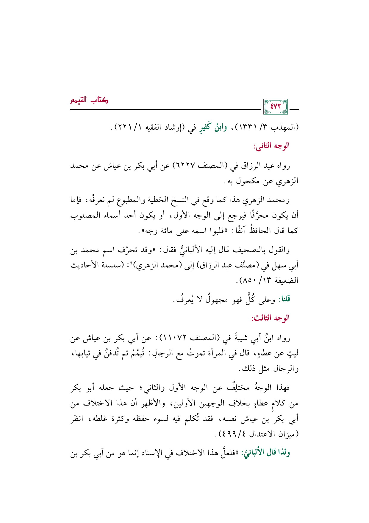 والقول بالتصحيف مَال إليه الألبانيُّ فقال: "وقد تحرَّف اسم محمد بن أبي سهل في (مصنَّف عبد الرزاق) إلى (محمد الزهري)! " (سلسلة الأحاديث الضعيفة ١٣/ ٨٥٠).