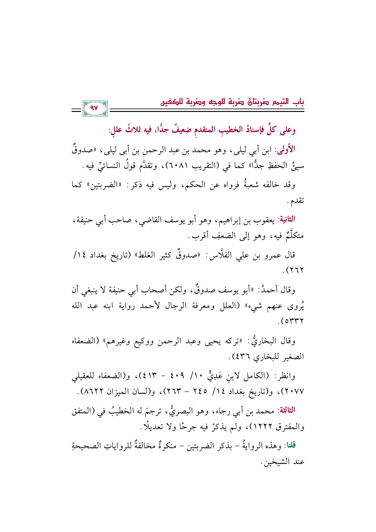 الأولى: ابن أبي ليلى، وهو محمد بن عبد الرحمن بن أبى ليلى، "صدوقٌ سيئُ الحفظِ جدًّا" كما في (التقريب ٦٠٨١)، وتقدَّم قولُ النسائيِّ فيه.