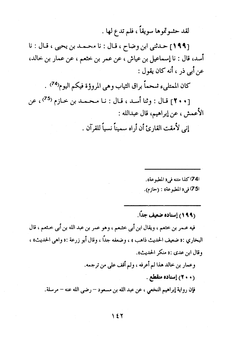 201 - قَالَ: وَثَنَا أَسَدٌ قَالَ: نا مُحَمَّدُ بْنُ خَازِمٍ , عَنِ الْأَعْمَشِ , عَنْ إِبْرَاهِيمَ , قَالَ عَبْدُ اللَّهِ: إِنِّي «§لَأَمْقُتُ الْقَارِئَ إِنْ أَرَاهُ سَمِينًا نَسِيًّا لِلْقُرْآنِ»