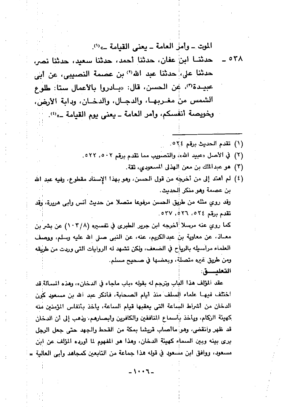538 - حَدَّثَنَا ابْنُ عَفَّانَ، حَدَّثَنَا أَحْمَدُ، حَدَّثَنَا سَعِيدٌ، حَدَّثَنَا نَصْرٌ، حَدَّثَنَا عَلِيٌّ، حَدَّثَنَا عَبْدُ اللَّهِ بْنُ عِصْمَةَ النَّصِيبِيُّ، عَنْ أَبِي عُبَيْدَةَ، عَنِ الْحَسَنِ، قَالَ: " §بَادِرُوا بِالْأَعْمَالِ سِتًّا: طُلُوعَ الشَّمْسِ مِنْ مَغْرِبِهَا، وَالدَّجَّالَ، وَالدُّخَانَ، وَدَابَّةَ الْأَرْضِ، وَخُوَيْصَّةَ أَنْفُسِكُمْ، وَأَمْرَ الْعَامَّةِ ". يَعْنِي يَوْمَ الْقِيَامَةِ