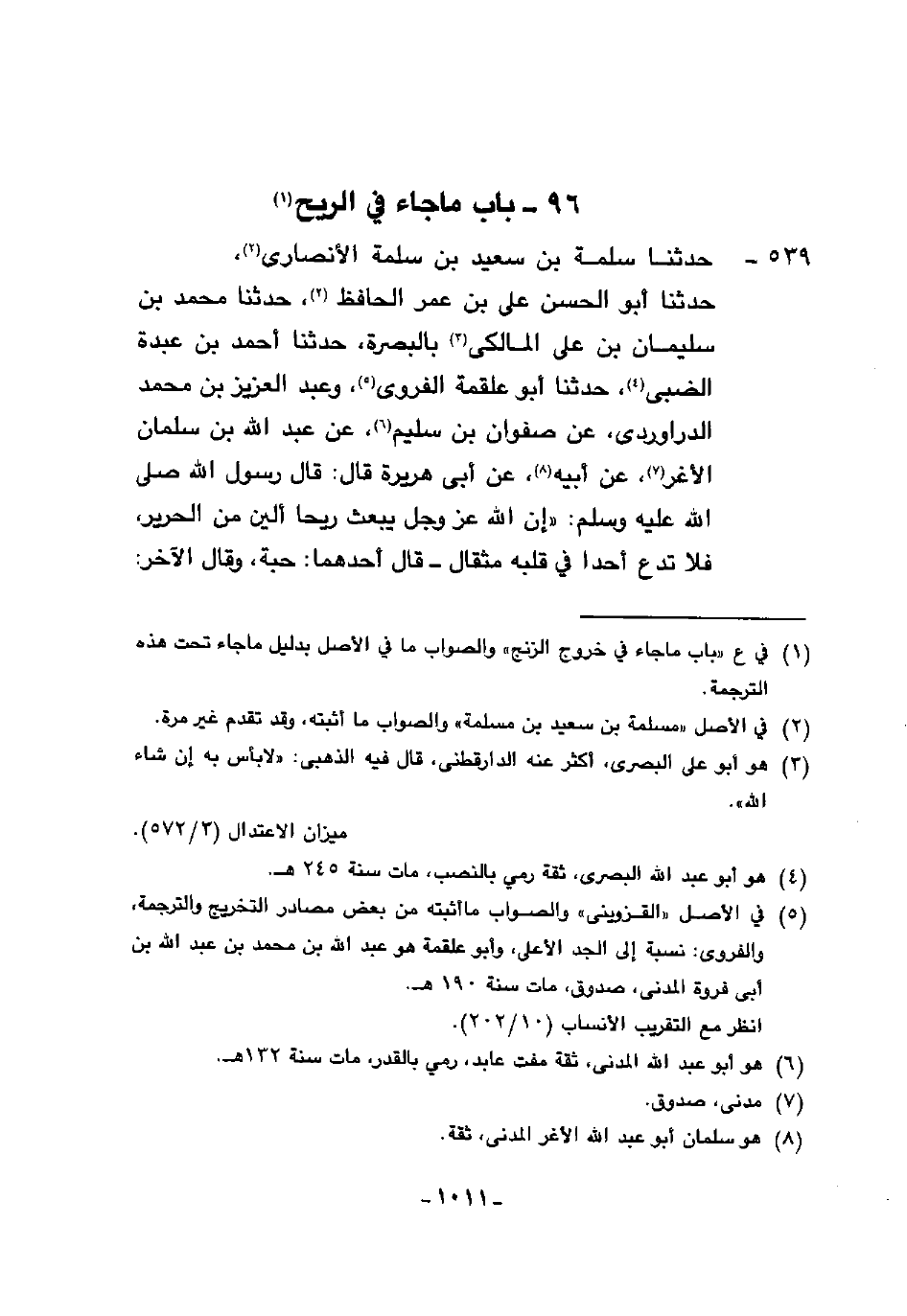 539 - حَدَّثَنَا سَلَمَةُ بْنُ سَعِيدِ بْنِ سَلَمَةَ الْأَنْصَارِيُّ، حَدَّثَنَا أَبُو الْحَسَنِ عَلِيُّ بْنُ عُمَرَ الْحَافِظُ، حَدَّثَنَا مُحَمَّدُ بْنُ سُلَيْمَانَ بْنِ عَلِيٍّ الْمَالِكِيُّ، بِالْبَصْرَةِ، حَدَّثَنَا أَحْمَدُ بْنُ عَبْدةَ الضَّبِّيُّ، حَدَّثَنَا أَبُو عَلْقَمَةَ الْفَرْوِيُّ، وعَبْدُ الْعَزِيزِ بْنُ مُحَمَّدٍ الدَّرَاوَرْدِيُّ، عَنْ صَفْوَانَ بْنِ سُلَيْمٍ، عَنْ عَبْدِ اللَّهِ بْنِ سَلْمَانَ الْأَغَرِّ، عَنْ أَبِيهِ، عَنْ أَبِي هُرَيْرَةَ، قَالَ: قَالَ رَسُولُ اللَّهِ صَلَّى اللهُ عَلَيْهِ وَسَلَّمَ: " إِنَّ §اللَّهَ عَزَّ وَجَلَّ يَبْعَثُ رِيحًا أَلْيَنَ مِنَ الْحَرِيرِ فَلَا تَدَعُ أَحَدًا فِي قَلْبِهِ مِثْقَالُ - قَالَ أَحَدُهُمَا: حَبَّةٍ، وَقَالَ الْآخَرُ -[1012]-: ذَرَّةٍ - مِنْ إِيمَانٍ إِلَّا قَبْضَتْهُ "