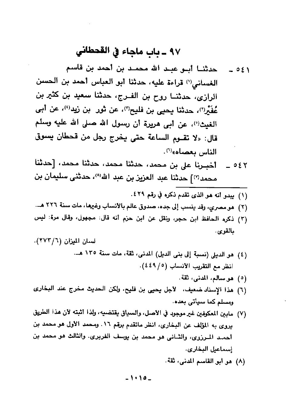 541 - حَدَّثَنَا أَبُو عَبْدِ اللَّهِ مُحَمَّدُ بْنُ أَحْمَدَ بْنِ قَاسِمٍ الْغَسَّانِيُّ قِرَاءَةً عَلَيْهِ، حَدَّثَنَا أَبُو الْعَبَّاسِ أَحْمَدُ بْنُ الْحَسَنِ الرَّازِيُّ، حَدَّثَنَا رَوْحُ بْنُ الْفَرَجِ، حَدَّثَنَا سَعِيدُ بْنُ كَثِيرِ بْنِ عُفَيْرٍ، حَدَّثَنَا يَحْيَى بْنُ فُلَيْحٍ، عَنْ ثَوْرِ بْنِ زَيْدٍ، عَنْ أَبِي الْغَيْثِ، عَنْ أَبِي هُرَيْرَةَ، أَنَّ رَسُولَ اللَّهِ صَلَّى اللهُ عَلَيْهِ وَسَلَّمَ، قَالَ: §«لَا تَقُومُ السَّاعَةُ حَتَّى يَخْرُجَ رَجُلٌ مِنْ قَحْطَانَ يَسُوقُ النَّاسَ بِعَصَاهُ»