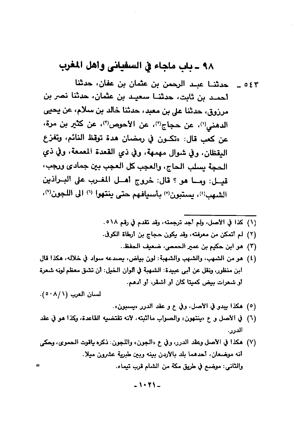 543 - حَدَّثَنَا عَبْدُ الرَّحْمَنِ بْنُ عُثْمَانَ بْنِ عَفَّانَ، حَدَّثَنَا أَحْمَدُ بْنُ ثَابِتٍ، حَدَّثَنَا سَعِيدُ بْنُ عُثْمَانَ، حَدَّثَنَا نَصْرُ بْنُ مَرْزُوقٍ، حَدَّثَنَا عَلِيُّ بْنُ مَعْبَدٍ، حَدَّثَنَا خَالِدُ بْنُ سَلَّامٍ، عَنْ يَحْيَى الدُّهْنِيِّ، عَنْ حَجَّاجٍ، عَنِ الْأَحْوَصِ، عَنْ كَثِيرِ بْنِ مُرَّةَ، عَنْ كَعْبٍ، قَالَ: " §تَكُونُ فِي رَمَضَانَ هَدَّةٌ تُوقِظُ النَّائِمَ وَتُفْزِعُ الْيَقْظَانَ، وَفِي شَوَّالٍ مَهْمَهَةٌ، وَفِي ذِي الْقَعْدَةِ الْمَعْمَعَةُ، وَفِي ذِي الْحِجَّةِ يُسْلَبُ الْحَاجُّ وَالْعَجَبُ كُلُّ الْعَجَبِ بَيْنَ جُمَادَى وَرَجَبٍ، قِيلَ: وَمَا هُوَ؟ قَالَ: خُرُوجُ أَهْلِ الْمَغْرِبِ عَلَى الْبَرَاذِينِ الشُّهُبِ يَسْتَبُونَ بِأَسْيَافِهِمْ حَتَّى يَنْتَهُوا إِلَى اللَّجُونِ -[1022]-، وَخُرُوجُ السُّفْيَانِيِّ، يَكُونُ لَهُ وَقْعَةٌ بَقَرْقِيسِيَاءَ وَوَقْعَةٌ بِعَاقَرْقُوبَ يُسْبَى فِيهَا الْوِلْدَانَ يُقْتَلُ فِيهَا مِائَةُ أَلْفٍ كُلُّهُمْ أَمِيرٌ وَصَاحِبُ سَيْفٍ مُحَلًّى