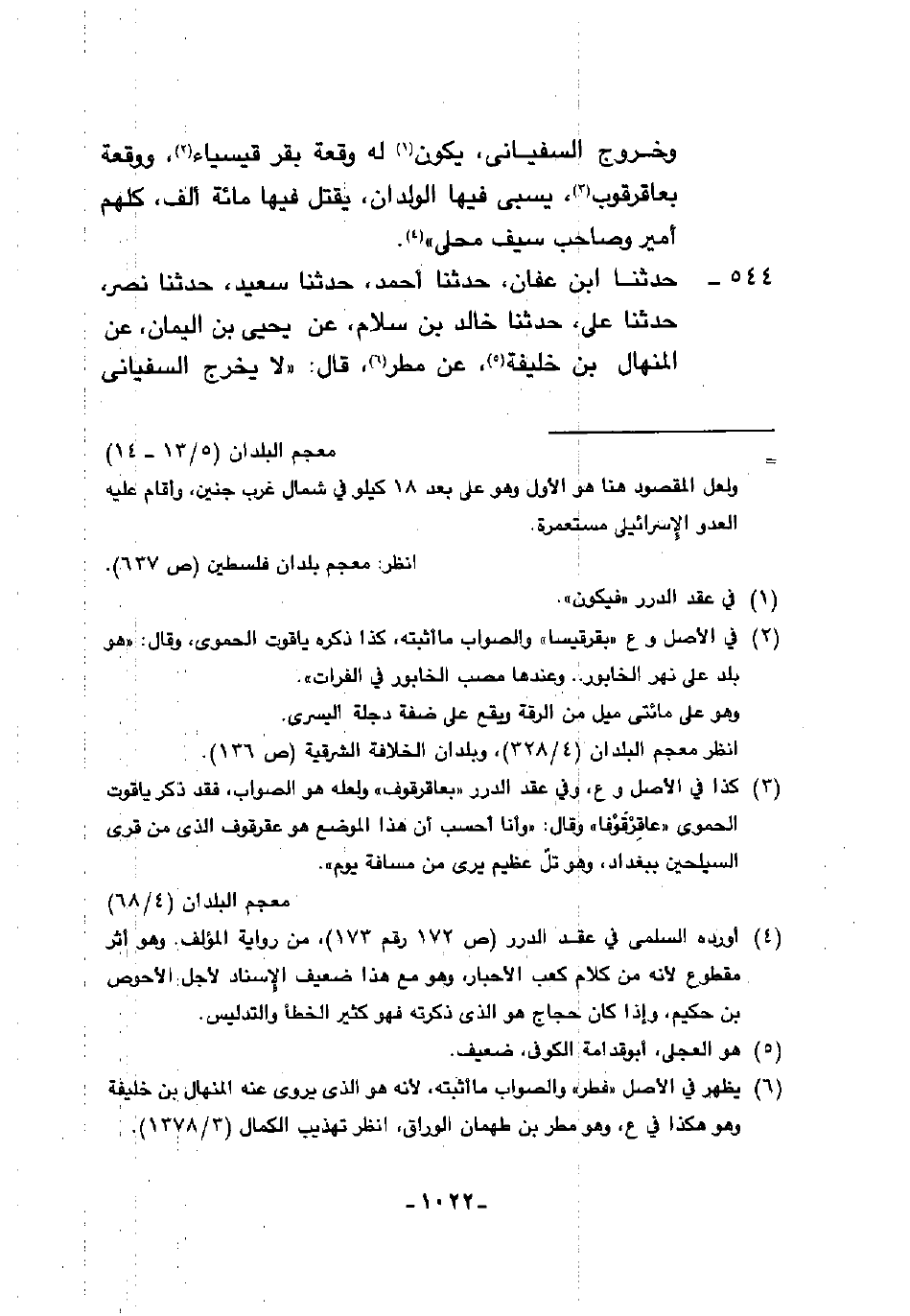 544 - حَدَّثَنَا ابْنُ عَفَّانَ، حَدَّثَنَا أَحْمَدُ، حَدَّثَنَا سَعِيدٌ، حَدَّثَنَا نَصْرٌ، حَدَّثَنَا عَلِيٌّ، حَدَّثَنَا خَالِدُ بْنُ سَلَّامٍ، عَنْ يَحْيَى بْنِ الْيَمَانِ، عَنِ الْمِنْهَالِ بْنِ خَلِيفَةَ، عَنْ مَطَرٍ، قَالَ: " §لَا يَخْرُجُ السُّفْيَانِيُّ -[1023]- حَتَّى يُكْفَرَ بِاللَّهِ جِهَارًا، وَيَبْصُقَ بَعْضُهُمْ فِي وُجُوهِ بَعْضٍ