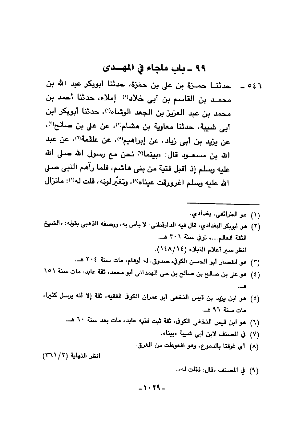 546 - حَدَّثَنَا حَمْزَةُ بْنُ عَلِيِّ بْنِ حَمْزَةَ، حَدَّثَنَا أَبُو بَكْرٍ عَبْدُ اللَّهِ بْنُ مُحَمَّدِ بْنِ الْقَاسِمِ بْنِ أَبِي خَلَّادٍ، إِمْلَاءً، حَدَّثَنَا أَحْمَدُ بْنُ مُحَمَّدِ بْنِ عَبْدِ الْعَزِيزِ بْنِ الْجَعْدِ الْوَشَّاءُ، حَدَّثَنَا أَبُو بَكْرِ بْنُ أَبِي شَيْبَةَ، حَدَّثَنَا مُعَاوِيَةُ بْنُ هِشَامٍ، عَنْ عَلِيِّ بْنِ صَالِحٍ، عَنْ يَزِيدَ بْنِ أَبِي زِيَادٍ، عَنْ إِبْرَاهِيمَ، عَنْ عَلْقَمَةَ، عَنْ عَبْدِ اللَّهِ بْنِ مَسْعُودٍ، قَالَ: بَيْنَمَا نَحْنُ مَعَ رَسُولِ اللَّهِ صَلَّى اللهُ عَلَيْهِ وَسَلَّمَ إِذْ أَقْبَلَ فِتْيَةٌ مِنْ بَنِي هَاشِمٍ فَلَمَّا رَآهُمُ النَّبِيُّ صَلَّى اللهُ عَلَيْهِ وَسَلَّمَ اغْرَوْرَقَتْ عَيْنَاهُ وَتَغَيَّرَ لَوْنُهُ قُلْتُ لَهُ: مَا نَزَالُ -[1030]- نَرَى فِي وَجْهِكَ شَيْئًا نَكْرَهُهُ، فَقَالَ: «§إِنَّا أَهْلُ بَيْتٍ اخْتَارَ اللَّهُ لَنَا الْآخِرَةَ عَلَى الدُّنْيَا، إِنَّ أَهْلَ بَيْتِي سَيَلْقَوْنَ بَعْدِي بَلَاءًا شَدِيدًا وَتَطْرِيدًا حَتَّى يَأْتِيَ قَوْمٌ مِنْ قِبَلِ الْمَشْرِقِ وَمَعَهُمْ رَايَاتٌ سُودٌ، فَيَسْأَلُونَ الْحَقَّ فَلَا يُعْطَوْنَهُ فَيُقَاتِلُونَ فَيُنْصَرُونَ، فَيُعْطَوْنَ مَا سَأَلُوا، فَلَا يَقْبَلُونَهُ حَتَّى يَدْفَعُوهَا إِلَى رَجُلٍ مِنْ أَهْلِ بَيْتِي، فَيَمْلَأَهَا قِسْطًا كَمَا مُلِئَتْ جَوْرًا فَمَنْ أَدْرَكَ ذَلِكَ مِنْكُمْ فَلْيَأْتِهِ حَبْوًا عَلَى الرُّكَبِ»