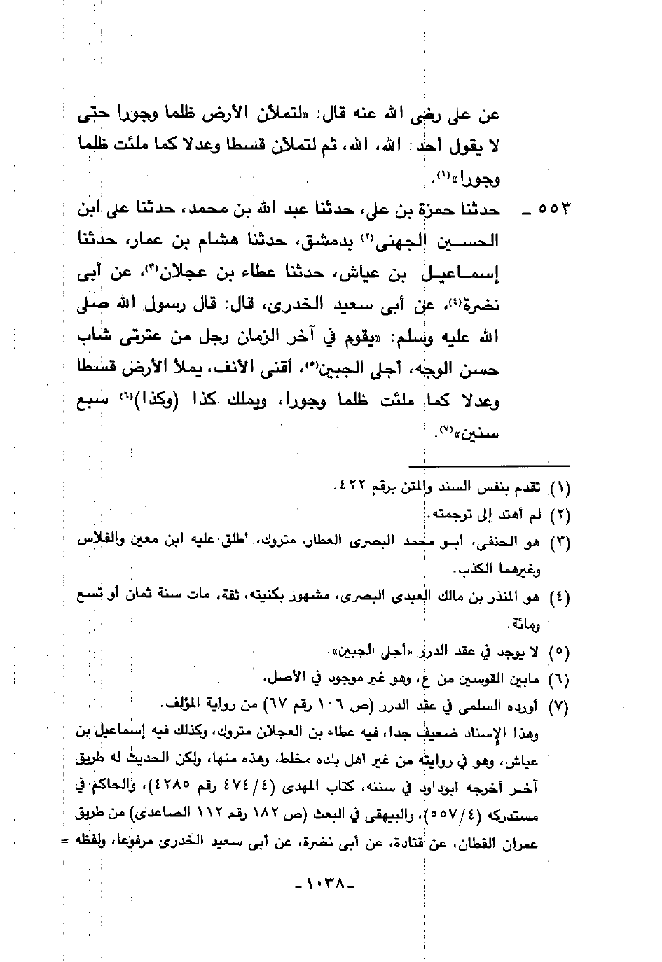 553 - حَدَّثَنَا حَمْزَةُ بْنُ عَلِيٍّ، حَدَّثَنَا عَبْدُ اللَّهِ بْنُ مُحَمَّدٍ، حَدَّثَنَا عَلِيُّ بْنُ الْحُسَيْنِ الْجُهَنِيُّ، بِدِمَشْقَ، حَدَّثَنَا هِشَامُ بْنُ عَمَّارٍ، حَدَّثَنَا إِسْمَاعِيلُ بْنُ عَيَّاشٍ، حَدَّثَنَا عَطَاءُ بْنُ عَجْلَانَ، عَنْ أَبِي نَضْرَةَ، عَنْ أَبِي سَعِيدٍ الْخُدْرِيِّ، قَالَ: قَالَ رَسُولُ اللَّهِ صَلَّى اللهُ عَلَيْهِ وَسَلَّمَ: §«يَقُومُ فِي آخِرِ الزَّمَانِ رَجُلٌ مِنْ عِتْرَتِي شَابٌّ حَسَنُ الْوَجْهِ أَجْلَى الْجَبِينِ أَقْنَى الْأَنْفِ يَمْلَأُ الْأَرْضَ قِسْطًا وَعَدْلًا كَمَا مُلِئَتْ ظُلْمًا وَجَوْرًا وَيَمْلِكُ كَذَا وَكَذَا سَبْعَ سِنِينَ»
