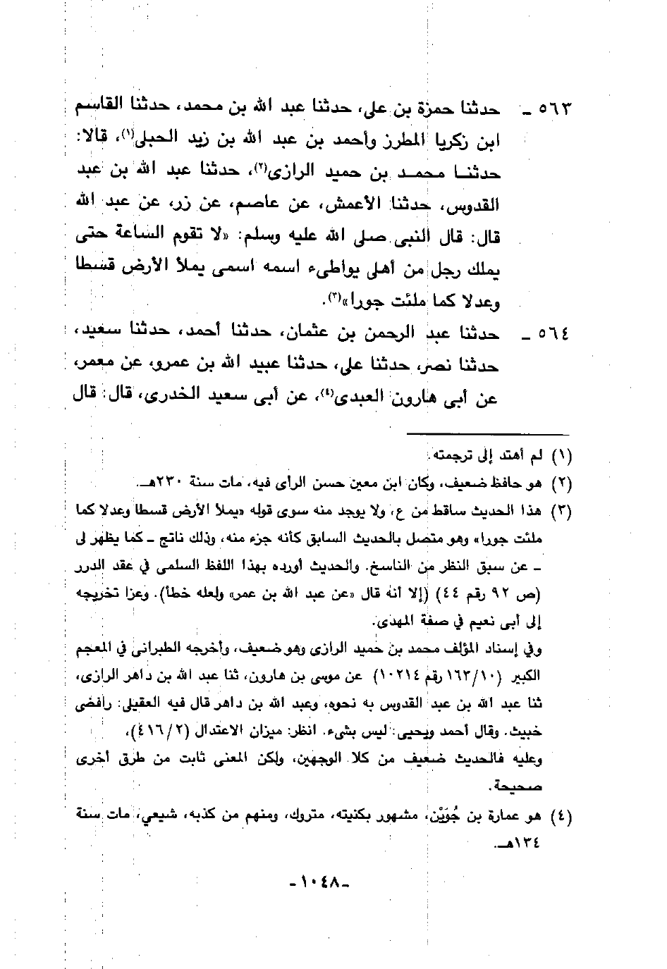 563 - حَدَّثَنَا حَمْزَةُ بْنُ عَلِيٍّ، حَدَّثَنَا عَبْدُ اللَّهِ بْنُ مُحَمَّدٍ، حَدَّثَنَا الْقَاسِمُ بْنُ زَكَرِيَّا الْمُطَرِّزُ، وَأَحْمَدُ بْنُ عَبْدِ اللَّهِ بْنِ زَيْدٍ الْحُبُلِيُّ، قَالَا: حَدَّثَنَا مُحَمَّدُ بْنُ حُمَيْدٍ الرَّازِيُّ، حَدَّثَنَا عَبْدُ اللَّهِ بْنُ عَبْدِ الْقُدُّوسِ، حَدَّثَنَا الْأَعْمَشُ، عَنْ عَاصِمٍ، عَنْ زِرٍّ، عَنْ عَبْدِ اللَّهِ، قَالَ: قَالَ النَّبِيُّ صَلَّى اللهُ عَلَيْهِ وَسَلَّمَ: §«لَا تَقُومُ السَّاعَةُ حَتَّى يَمْلِكَ رَجُلٌ مِنْ أَهْلِي يُوَاطِئُ اسْمُهُ اسْمِي يَمْلَأُ الْأَرْضَ قِسْطًا وَعَدْلًا كَمَا مُلِئَتْ جَوْرًا»