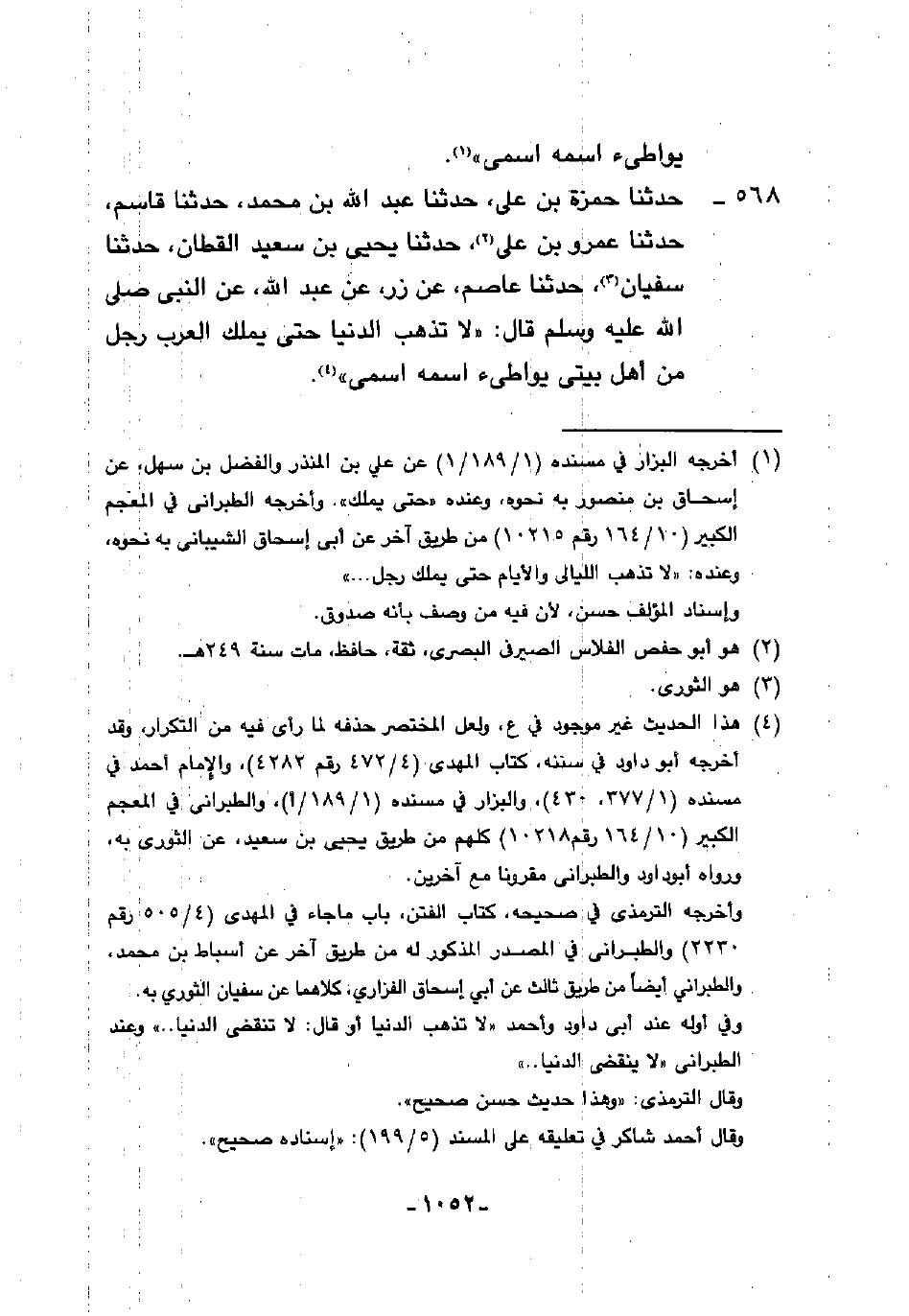 568 - حَدَّثَنَا حَمْزَةُ بْنُ عَلِيٍّ، حَدَّثَنَا عَبْدُ اللَّهِ بْنُ مُحَمَّدٍ، حَدَّثَنَا قَاسِمٌ، حَدَّثَنَا عَمْرُو بْنُ عَلِيٍّ، حَدَّثَنَا يَحْيَى بْنُ سَعِيدٍ الْقَطَّانُ، حَدَّثَنَا سُفْيَانُ، حَدَّثَنَا عَاصِمٌ، عَنْ زِرٍّ، عَنْ عَبْدِ اللَّهِ، عَنِ النَّبِيِّ صَلَّى اللهُ عَلَيْهِ وَسَلَّمَ، قَالَ: §«لَا تَذْهَبُ الدُّنْيَا حَتَّى يَمْلِكَ الْعَرَبَ رَجُلٌ مِنْ أَهْلِ بَيْتِي يُوَاطِئُ اسْمُهُ اسْمِي»