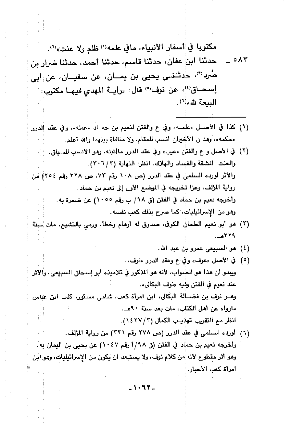 583 - حَدَّثَنَا ابْنُ عَفَّانَ، حَدَّثَنَا قَاسِمٌ، حَدَّثَنَا أَحْمَدُ، حَدَّثَنَا ضِرَارُ بْنُ صُرَدَ، حَدَّثَنِي يَحْيَى بْنُ يَمَانٍ، عَنْ سُفْيَانَ، عَنْ أَبِي إِسْحَاقَ، عَنْ نَوْفٍ، قَالَ: " §رَايَةُ الْمَهْدِيِّ فِيهَا مَكْتُوبٌ: الْبَيْعَةُ لِلَّهِ "