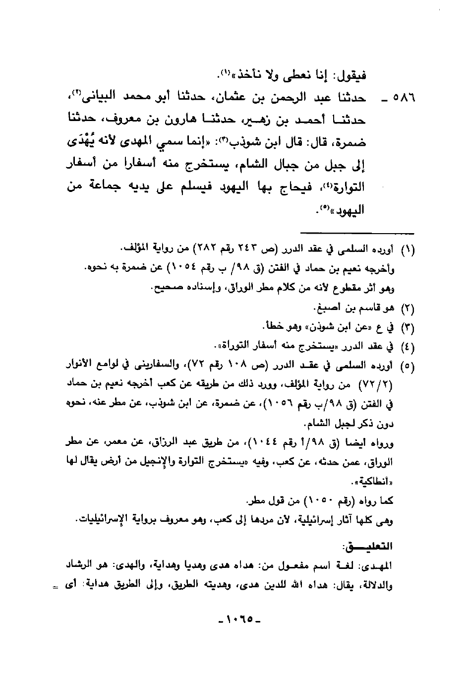 586 - حَدَّثَنَا عَبْدُ الرَّحْمَنِ بْنُ عُثْمَانَ، حَدَّثَنَا أَبُو مُحَمَّدٍ الْبَيَانِيُّ، حَدَّثَنَا أَحْمَدُ بْنُ زُهَيْرٍ، حَدَّثَنَا هَارُونُ بْنُ مَعْرُوفٍ، حَدَّثَنَا ضَمْرَةُ، قَالَ: قَالَ ابْنُ شَوْذَبٍ: " إِنَّمَا §سُمِّيَ الْمَهْدِيَّ لِأَنَّهُ يُهْدَى إِلَى جَبَلٍ مِنْ جِبَالِ الشَّامِ يَسْتَخْرِجُ مِنْهُ أَسْفَارًا مِنْ أَسْفَارِ التَّوْرَاةِ فَيُحَاجَّ بِهَا الْيَهُودَ فَيُسْلِمُ عَلَى يَدَيْهِ جَمَاعَةٌ مِنَ الْيَهُودِ