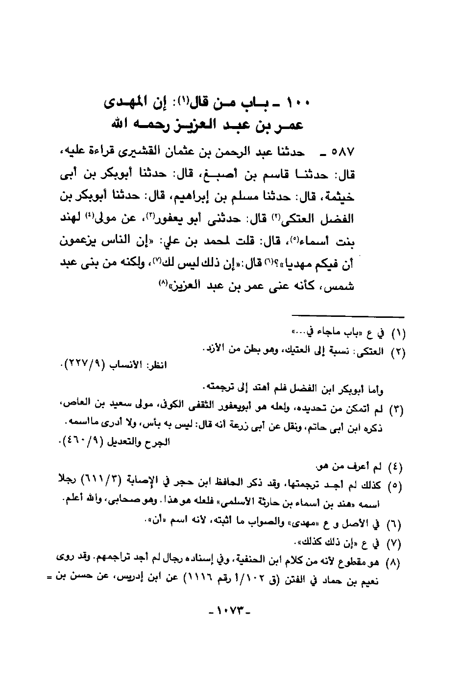 587 - حَدَّثَنَا عَبْدُ الرَّحْمَنِ بْنُ عُثْمَانَ الْقُشَيْرِيُّ، قِرَاءَةً عَلَيْهِ، قَالَ: حَدَّثَنَا قَاسِمُ بْنُ أَصْبَغَ، قَالَ: حَدَّثَنَا أَبُو بَكْرِ بْنُ أَبِي خَيْثَمَةَ، قَالَ: حَدَّثَنَا مُسْلِمُ بْنُ إِبْرَاهِيمَ، قَالَ: حَدَّثَنَا أَبُو بَكْرِ بْنُ الْفَضْلِ الْعَتَكِيُّ، قَالَ: حَدَّثَنِي أَبُو يَعْفُورٍ، عَنْ مَوْلًى، لِهِنْدِ بِنْتِ أَسْمَاءَ قَالَ: قُلْتُ لِمُحَمَّدِ بْنِ عَلِيٍّ، إِنَّ §النَّاسَ يَزْعُمُونَ أَنَّ فِيكُمْ، مَهْدِيًّا، قَالَ: «إِنَّ ذَلِكَ لَيْسَ لَكَ وَلَكِنَّهُ مِنْ بَنِي عَبْدِ شَمْسٍ» كَأَنَّهُ عَنَى عُمَرَ بْنَ عَبْدِ الْعَزِيزِ