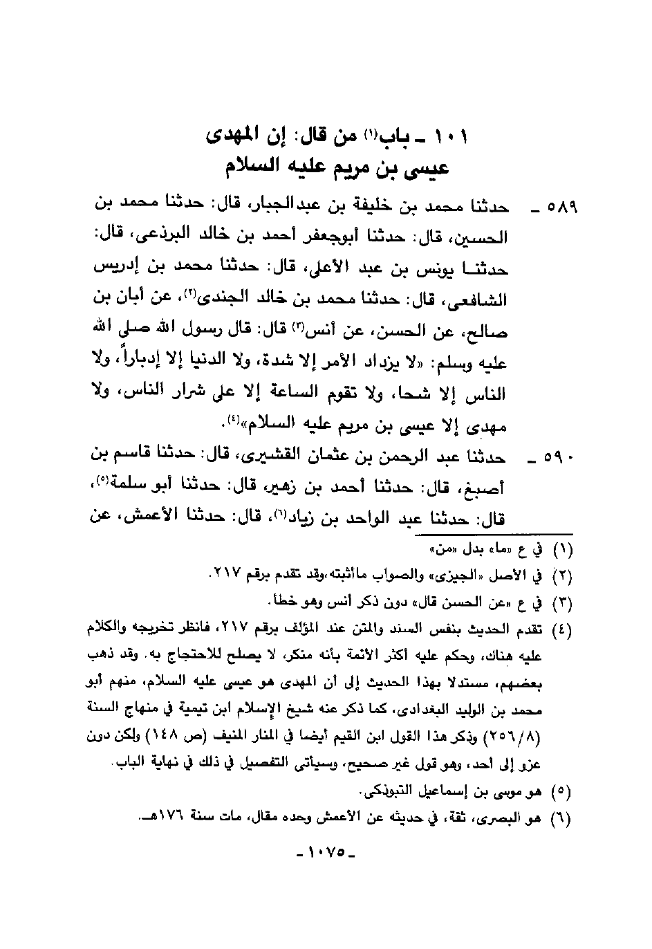 590 - حَدَّثَنَا عَبْدُ الرَّحْمَنِ بْنُ عُثْمَانَ الْقُشَيْرِيُّ، قَالَ: حَدَّثَنَا قَاسِمُ بْنُ أَصْبَغَ، قَالَ: حَدَّثَنَا أَحْمَدُ بْنُ زُهَيْرٍ، قَالَ: حَدَّثَنَا أَبُو سَلَمَةَ، قَالَ: حَدَّثَنَا عَبْدُ الْوَاحِدِ بْنُ زِيَادٍ، قَالَ: حَدَّثَنَا الْأَعْمَشُ، عَنْ -[1076]- إِبْرَاهِيمَ، قَالَ: " كَانَ أَصْحَابُ عَبْدِ اللَّهِ يَقُولُونَ: §الْمَهْدِيُّ عِيسَى ابْنُ مَرْيَمَ "