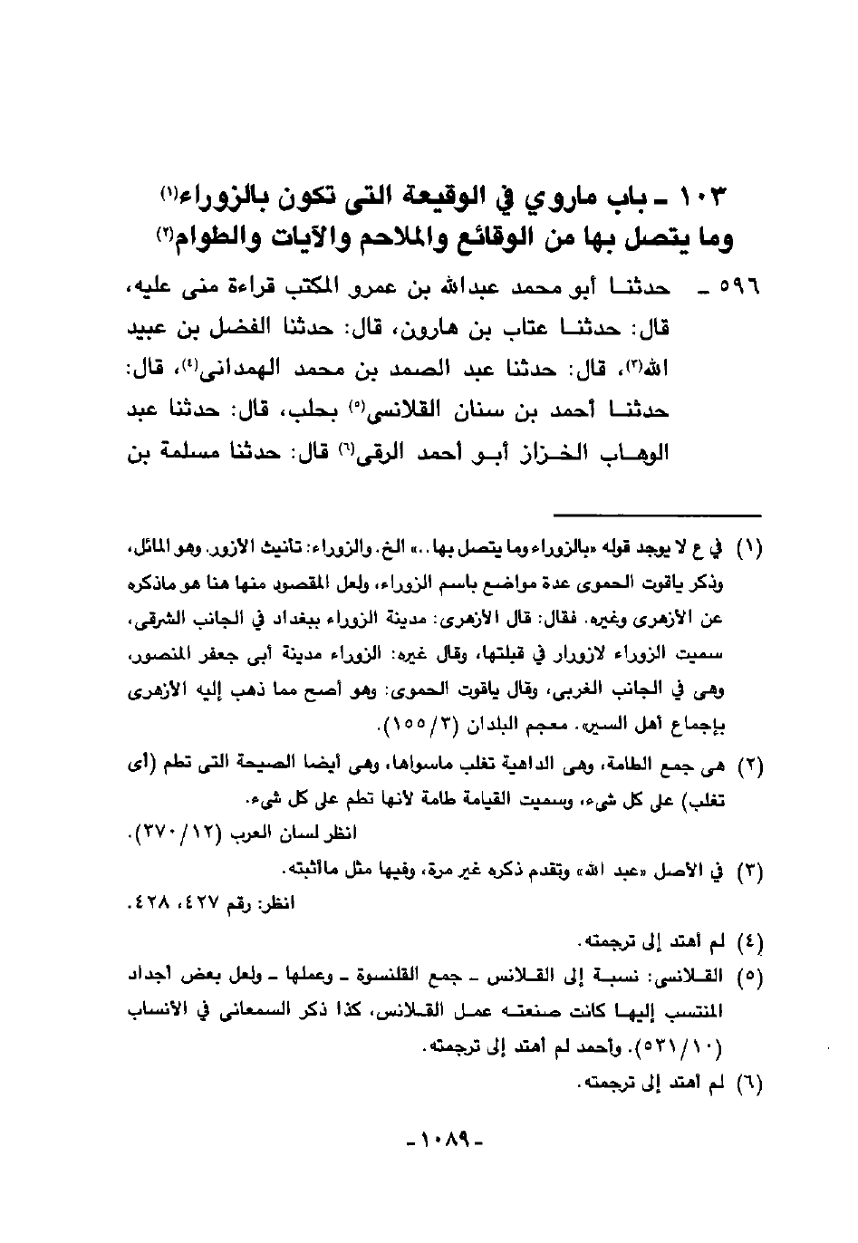 حَدَّثَنَا أَبُو مُحَمَّدٍ عَبْدُ اللَّهِ بْنُ عَمْرٍو الْمُكْتِبُ، قِرَاءَةً مِنِّي عَلَيْهِ، قَالَ: حَدَّثَنَا عَتَّابُ بْنُ هَارُونَ، قَالَ: حَدَّثَنَا الْفَضْلُ بْنُ عُبَيْدِ اللَّهِ، قَالَ: حَدَّثَنَا عَبْدُ الصَّمَدِ بْنُ مُحَمَّدٍ الْهَمْدَانِيُّ، قَالَ: حَدَّثَنَا أَحْمَدُ بْنُ سِنَانٍ الْقَلَانِسِيُّ، بِحَلَبَ، قَالَ: حَدَّثَنَا عَبْدُ الْوَهَّابِ الْخَزَّازُ أَبُو أَحْمَدَ الرَّقِّيُّ، قَالَ: حَدَّثَنَا مَسْلَمَةُ بْنُ -[1090]- ثَابِتٍ، عَنْ عَبْدِ الرَّحْمَنِ، عَنْ سُفْيَانَ الثَّوْرِيِّ، عَنْ قَيْسِ بْنِ مُسْلِمٍ، عَنْ رِبْعِيِّ بْنِ حِرَاشٍ، عَنْ حُذَيْفَةَ، قَالَ: قَالَ رَسُولُ اللَّهِ صَلَّى اللهُ عَلَيْهِ وَسَلَّمَ: «§تَكُونُ وَقْعَةٌ بِالزَّوْرَاءِ» قَالُوا: يَا رَسُولَ اللَّهِ وَمَا الزَّوْرَاءُ؟ قَالَ: " مَدِينَةٌ بِالْمَشْرِقِ بَيْنَ أَنْهَارٍ يَسْكُنُهَا شِرَارُ خَلْقِ اللَّهِ وَجَبَابِرَةٌ مِنْ أُمَّتِي، تُقْذَفُ بِأَرْبَعَةِ أَصْنَافٍ مِنَ الْعَذَابِ: بِالسَّيْفِ، وَخَسْفٍ وَقَذْفٍ وَمَسْخٍ " وَقَالَ صَلَّى اللهُ عَلَيْهِ وَسَلَّمَ: " إِذَا خَرَجَتِ السُّودَانُ طَلَبَتِ الْعَرَبَ يَنْكَشِفُونَ حَتَّى يَلْحَقُوا بِبَطْنِ الْأَرْضِ - أَوْ قَالَ: بِبَطْنِ الْأُرْدُنِّ - فَبَيْنَمَا هُمْ كَذَلِكَ إِذْ خَرَجَ السُّفْيَانِيُّ فِي سِتِّينَ وَثَلَاثِمِائَةِ رَاكِبٍ حَتَّى يَأْتِيَ دِمَشْقَ، فَلَا يَأْتِي عَلَيْهِ شَهْرٌ حَتَّى يُبَايِعَهُ مِنْ كَلْبٍ ثَلَاثُونَ أَلْفًا، فَيَبْعَثُ جَيْشًا إِلَى الْعِرَاقِ، فَيُقْتَلُ بِالزَّوْرَاءِ مِائَةُ أَلْفٍ، وَيَنْحَدِرُونَ إِلَى الْكُوفَةِ فَيَنْهَبُونَهَا، فَعِنْدَ ذَلِكَ تَخْرُجُ دَابَّةٌ مِنَ الْمَشْرِقِ يَقُودُهَا رَجُلٌ مِنْ بَنِي تَمِيمٍ يُقَالُ لَهُ -[1091]- شُعَيْبُ بْنُ صَالِحٍ فَيَسْتَنْقِذُ مَا فِي أَيْدِيهِمْ مِنْ سَبْي أَهْلِ الْكُوفَةِ وَيَقْتُلُهُمْ، وَيَخْرُجُ جَيْشٌ آخَرُ مِنْ جُيُوشِ السُّفْيَانِيِّ إِلَى الْمَدِينَةِ فَيَنْهَبُونَهَا ثَلَاثَةَ أَيَّامٍ ثُمَّ يَسِيرُونَ إِلَى مَكَّةَ، حَتَّى إِذَا كَانُوا بِالْبَيْدَاءِ بَعَثَ اللَّهُ عَزَّ وَجَلَّ جِبْرِيلَ عَلَيْهِ السَّلَامُ فَيَقُولُ: يَا جِبْرِيلُ عَذِّبْهُمْ فَيَضْرِبْهُمْ بِرِجْلِهِ ضَرْبَةً، فَيَخْسِفُ اللَّهُ عَزَّ وَجَلَّ بِهِمْ فَلَا يَبْقَى مِنْهُمْ إِلَّا رَجُلَانِ فَيَقْدَمَانِ عَلَى السُّفْيَانِيِّ فَيُخْبِرَانِهِ خَسْفَ الْجَيْشِ، فَلَا يَهُولُهُ، ثُمَّ إِنَّ رِجَالًا مِنْ قُرَيْشٍ يَهْرُبُونَ إِلَى قُسْطَنْطِينِيَّةَ، فَيَبْعَثُ السُّفْيَانِيُّ إِلَى عَظِيمِ الرُّومِ أَنِ ابْعَثْ إِلَىَّ بِهِمْ فِي الْمَجَامِعِ قَالَ: فَيَبْعَثُ بِهِمْ إِلَيْهِ فَيَضْرِبُ أَعْنَاقَهُمْ عَلَى بَابِ الْمَدِينَةِ بِدِمَشْقَ، قَالَ حُذَيْفَةُ: حَتَّى إِنَّهُ يُطَافُ بِالْمَرْأَةِ فِي مَسْجِدِ دِمَشْقَ فِي الثَّوْبِ عَلَى مَجْلِسٍ مَجْلِسٍ حَتَّى تَأْتِيَ فَخِذَ السُّفْيَانِيِّ فَتَجْلِسُ عَلَيْهِ وَهُوَ فِي الْمِحْرَابِ قَاعِدٌ، فَيَقُومُ رَجُلٌ مِنَ الْمُسْلِمِينَ فَيَقُولُ: وَيْحَكُمْ أَكَفَرْتُمْ بِاللَّهِ بَعْدَ إِيمَانِكُمْ، إِنَّ هَذَا لَا يَحِلُّ، فَيَقُومُ فَيَضْرِبُ عُنُقَهُ فِي مَسْجِدِ دِمَشْقَ، وَيَقْتُلُ -[1092]- كُلَّ مَنْ شَايَعَهُ عَلَى ذَلِكَ، فَعِنْدَ ذَلِكَ يُنَادِي مِنَ السَّمَاءِ مُنَادٍ: أَيُّهَا النَّاسُ إِنَّ اللَّهَ عَزَّ وَجَلَّ قَدْ قَطَعَ عَنْكُمْ مُدَّةَ الْجَبَّارِينَ وَالْمُنَافِقِينَ وَأَشْيَاعِهِمْ وَأَتْبَاعِهِمْ وَوَلَّاكُمْ خَيْرَ أُمَّةِ مُحَمَّدٍ صَلَّى اللهُ عَلَيْهِ وَسَلَّمَ، فَالْحَقُوا بِهِ بِمَكَّةَ فَإِنَّهُ الْمَهْدِيُّ وَاسْمُهُ أَحْمَدُ بْنُ عَبْدِ اللَّهِ، قَالَ حُذَيْفَةُ: فَقَا