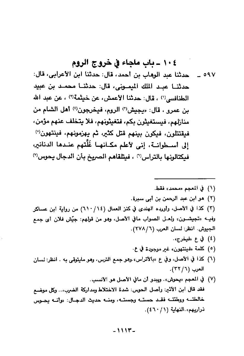 597 - حَدَّثَنَا عَبْدُ الْوَهَّابِ بْنُ أَحْمَدَ، قَالَ: حَدَّثَنَا ابْنُ الْأَعْرَابِيِّ، قَالَ: حَدَّثَنَا عَبْدُ الْمَلِكِ الْمَيْمُونِيُّ، قَالَ: حَدَّثَنَا مُحَمَّدُ بْنُ عُبَيْدٍ الطَّنَافِسِيُّ، قَالَ: حَدَّثَنَا الْأَعْمَشُ، عَنْ خَيْثَمَةَ، عَنْ عَبْدِ اللَّهِ بْنِ عَمْرٍو، قَالَ: «§يُجَيِّشُ الرُّومُ فَيُخْرِجُونَ أَهْلَ الشَّامِ مِنْ مَنَازِلِهِمْ فَيَسْتَغِيثُونَ بِكُمْ، فَتُغِيثُونَهُمْ، فَلَا يَتَخَلَّفُ عَنْهُمْ مُؤْمِنٌ، فَيَقْتَتِلُونَ فَيَكُونُ بَيْنَهُمْ قَتْلٌ كَثِيرٌ، ثُمَّ يَهْزِمُونَهُمْ فَيَنْتَهُونَ إِلَى أُسْطُوَانَةٍ إِنَّى لَأَعْلَمُ مَكَانَهَا غَلَّتُهُمْ عِنْدَهَا الدَّنَانِيرُ فَيَكْتَالُونَهَا بِالتِّرَاسِ فَيَتَلَقَّاهُمُ الصَّرِيخُ بِأَنَّ الدَّجَّالَ يَحُوسُ -[1114]- ذَرَارِيَّكُمْ فَيُلْقُونَ مَا فِي أَيْدِيهِمْ ثُمَّ يَأْتُونَ»