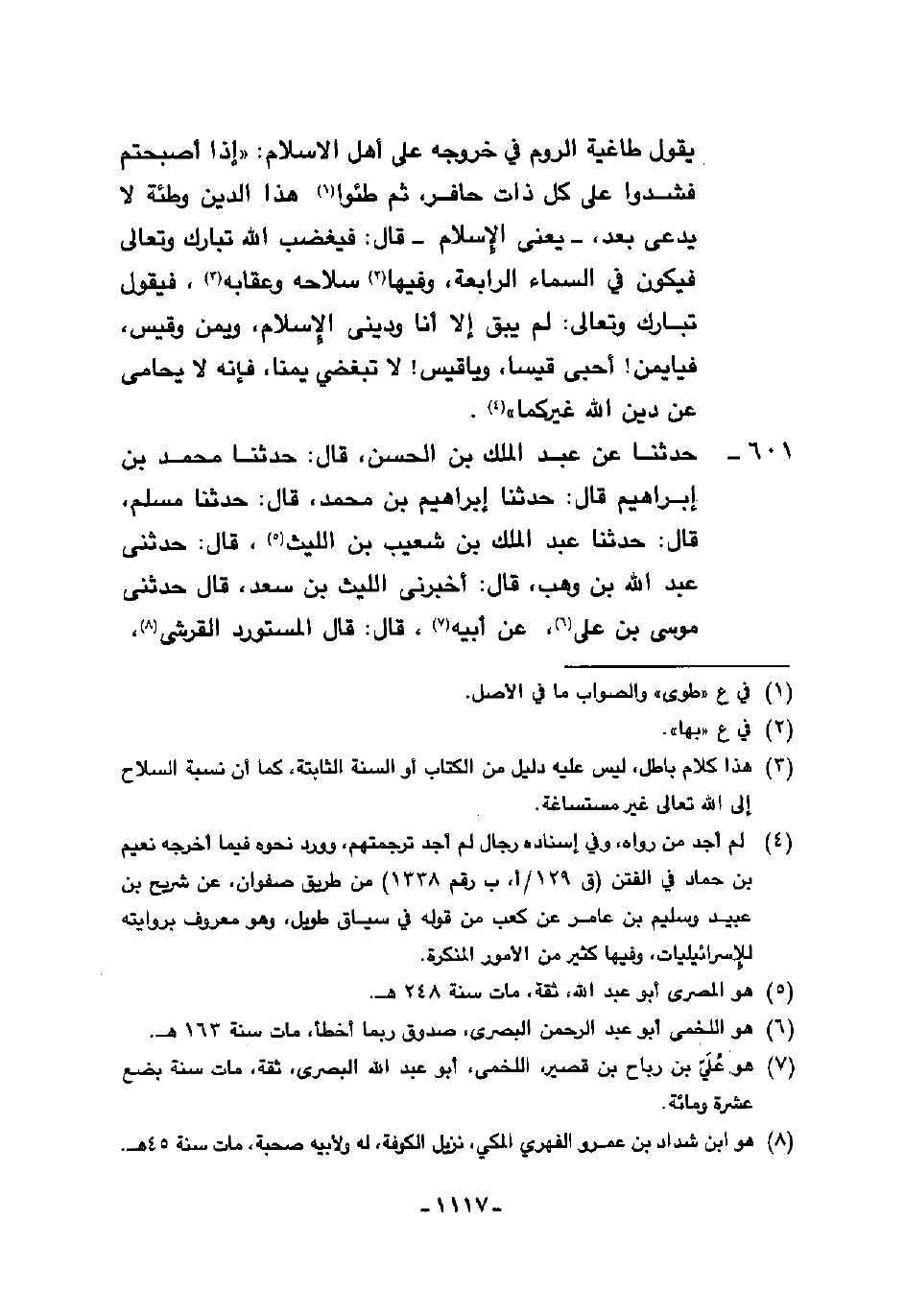 601 - حُدِّثْنَا عَنْ عَبْدِ الْمَلِكِ بْنِ الْحَسَنِ، قَالَ: حَدَّثَنَا مُحَمَّدُ بْنُ إِبْرَاهِيمَ، قَالَ: حَدَّثَنَا إِبْرَاهِيمُ بْنُ مُحَمَّدٍ، قَالَ: حَدَّثَنَا مُسْلِمٌ، قَالَ: حَدَّثَنَا عَبْدُ الْمَلِكِ بْنُ شُعَيْبِ بْنِ اللَّيْثِ، قَالَ: حَدَّثَنِي عَبْدُ اللَّهِ بْنُ وَهْبٍ، قَالَ: أَخْبَرَنِي اللَّيْثُ بْنُ سَعْدٍ، قَالَ: حَدَّثَنِي مُوسَى بْنُ عُلَيٍّ، عَنْ أَبِيهِ، قَالَ: قَالَ الْمُسْتَوْرِدُ الْقُرَشِيُّ -[1118]- عِنْدَ عَمْرِو بْنِ الْعَاصِ: سَمِعْتُ رَسُولَ اللَّهِ صَلَّى اللهُ عَلَيْهِ وَسَلَّمَ، يَقُولُ: §«تَقُومُ السَّاعَةُ وَالرُّومُ أَكْثَرُ النَّاسِ» فَقَالَ لَهُ عَمْرٌو: أَبْصِرْ مَا تَقُولُ، قَالَ: أَقُولُ مَا سَمِعْتُ مِنْ رَسُولِ اللَّهِ صَلَّى اللهُ عَلَيْهِ وَسَلَّمَ، قَالَ: " لَئِنْ قُلْتَ ذَلِكَ إِنَّ فِيهِمْ لَخِصَالًا أَرْبَعًا: إِنَّهُمْ لَأَحْلَمُ النَّاسِ عِنْدَ فِتْنَةٍ، وَأَسْرَعُهُمْ إِفَاقَةً بَعْدَ مُصِيبَةٍ، وَأَوْشَكُهُمْ كَرَّةً بَعْدَ فَرَّةٍ، وَخَيْرُهُمْ لِمِسْكِينٍ وَيَتِيمٍ وَضَعِيفٍ، وَخَامِسَةٌ حَسَنَةٌ جَمِيلَةٌ: وَأَمْنَعُهُمْ مِنْ ظُلْمِ الْمُلُوكِ "
