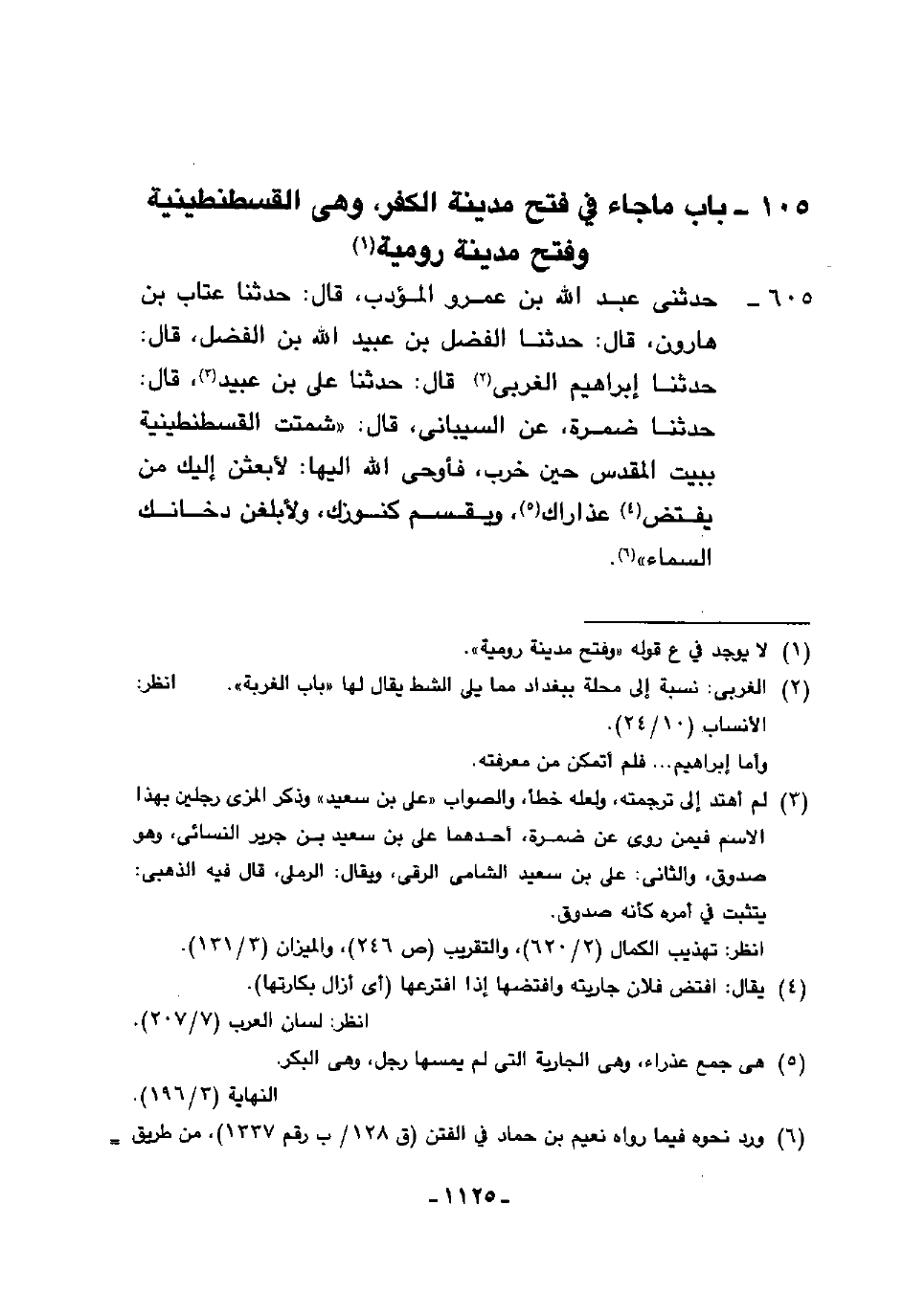605 - حَدَّثَنِي عَبْدُ اللَّهِ بْنُ عَمْرٍو الْمُؤَدِّبُ، قَالَ: حَدَّثَنَا عَتَّابُ بْنُ هَارُونَ، قَالَ: حَدَّثَنَا الْفَضْلُ بْنُ عُبَيْدِ اللَّهِ بْنِ الْفَضْلِ، قَالَ: حَدَّثَنَا إِبْرَاهِيمُ الْغَرْبِيُّ، قَالَ: حَدَّثَنَا عَلِيُّ بْنُ عُبَيْدٍ، قَالَ: حَدَّثَنَا ضَمْرَةُ، عَنِ السَّيْبَانِيِّ، قَالَ: " §شَمَتَتِ الْقُسْطَنْطِينِيَّةُ بِبَيْتِ الْمَقْدِسِ حِينَ خَرِبَ، فَأَوْحَى اللَّهُ إِلَيْهَا: لَأَبْعَثَنَّ إِلَيْكِ مِنْ يَفْتَضُّ عَذَارَاكِ وَيُقَسِّمُ كُنُوزَكِ وَلَأُبَلِّغَنَّ دُخَانَكِ السَّمَاءَ "