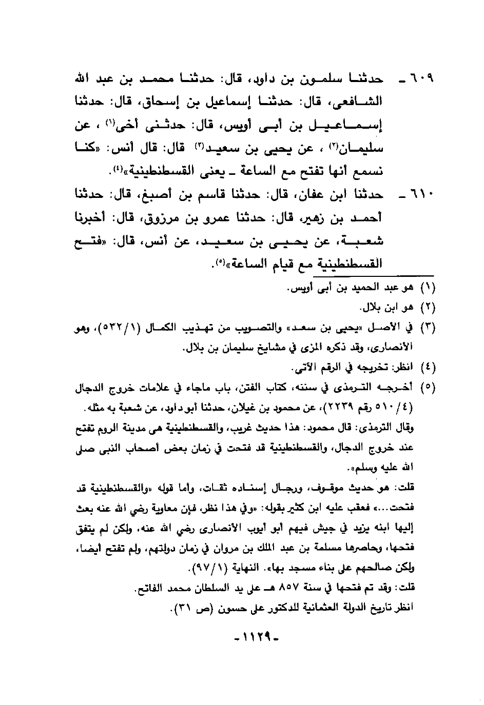 609 - حَدَّثَنَا سَلَمُونُ بْنُ دَاوُدَ، قَالَ: حَدَّثَنَا مُحَمَّدُ بْنُ عَبْدِ اللَّهِ الشَّافِعِيُّ، قَالَ: حَدَّثَنَا إِسْمَاعِيلُ بْنُ إِسْحَاقَ، قَالَ: حَدَّثَنَا إِسْمَاعِيلُ بْنُ أَبِي أُوَيْسٍ، قَالَ: حَدَّثَنِي أَخِي، عَنْ سُلَيْمَانَ، عَنْ يَحْيَى بْنِ سَعِيدٍ، قَالَ: قَالَ أَنَسٌ: «كُنَّا §نَسْمَعُ أَنَّهَا تُفْتَحُ مَعَ السَّاعَةِ» يَعْنِي الْقُسْطَنْطِينِيَّةَ