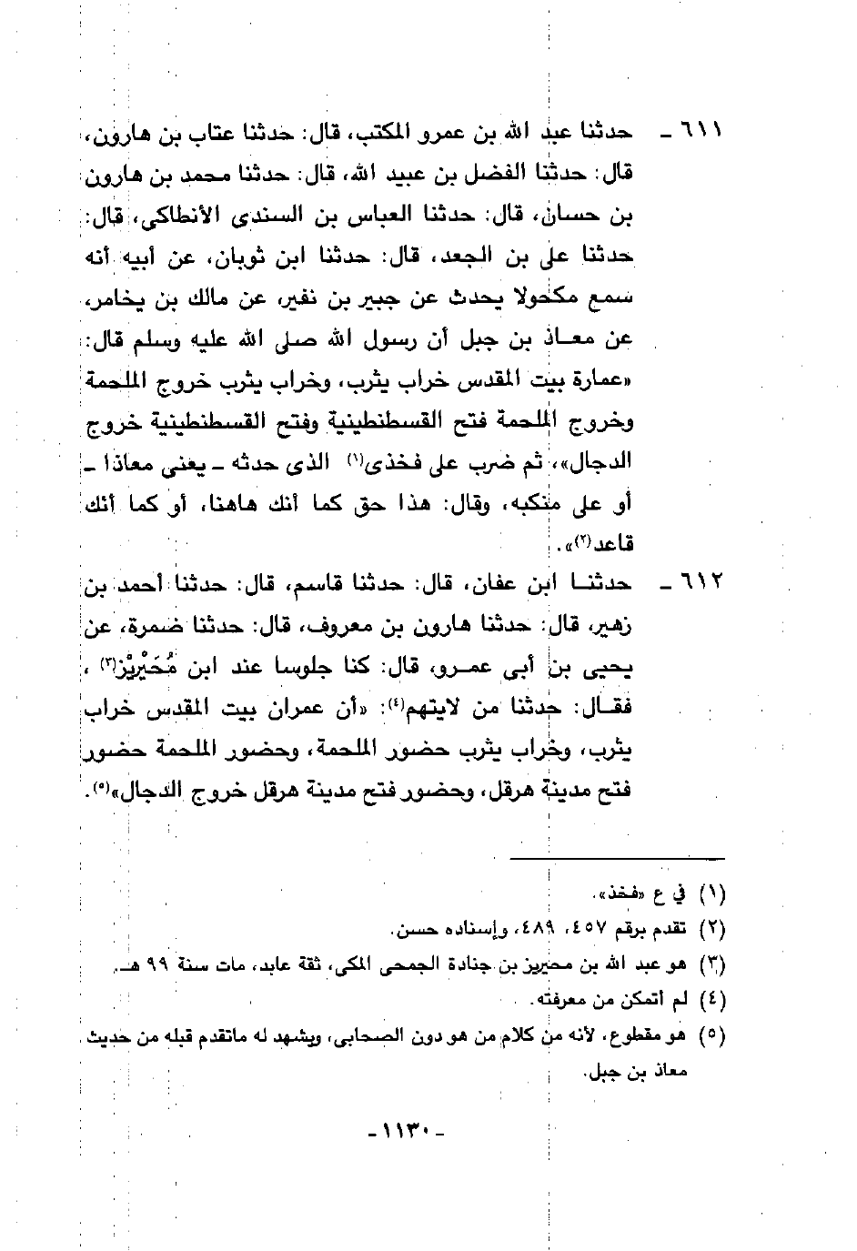 611 - حَدَّثَنَا عَبْدُ اللَّهِ بْنُ عَمْرٍو الْمُكْتِبُ، قَالَ: حَدَّثَنَا عَتَّابُ بْنُ هَارُونَ، قَالَ: حَدَّثَنَا الْفَضْلُ بْنُ عُبَيْدِ اللَّهِ، قَالَ: حَدَّثَنَا مُحَمَّدُ بْنُ هَارُونَ بْنِ حَسَّانَ، قَالَ: حَدَّثَنَا الْعَبَّاسُ بْنُ السِّنْدِيِّ الْأَنْطَاكِيُّ، قَالَ: حَدَّثَنَا عَلِيُّ بْنُ الْجَعْدِ، قَالَ: حَدَّثَنَا ابْنُ ثَوْبَانَ، عَنْ أَبِيهِ، أَنَّهُ سَمِعَ مَكْحُولًا، يُحَدِّثُ، عَنْ جُبَيْرِ بْنِ نُفَيْرٍ، عَنْ مَالِكِ بْنِ يَخَامِرَ، عَنْ مُعَاذِ بْنِ جَبَلٍ، أَنَّ رَسُولَ اللَّهِ صَلَّى اللهُ عَلَيْهِ وَسَلَّمَ، قَالَ: «§عِمَارَةُ بَيْتِ الْمَقْدِسِ خَرَابُ يَثْرِبَ، وَخَرَابُ يَثْرِبَ خُرُوجُ الْمَلْحَمَةِ، وَخُرُوجُ الْمَلْحَمَةِ فَتْحُ الْقُسْطَنْطِينِيَّةِ، وَفَتْحُ الْقُسْطَنْطِينِيَّةِ خُرُوجُ الدَّجَّالِ» ثُمَّ ضَرَبَ عَلَى فَخِذَيِ الَّذِي حَدَّثَهُ يَعْنِي مُعَاذًا، أَوْ عَلَى مَنْكِبِهِ وَقَالَ: «هَذَا حَقٌّ كَمَا أَنَّكَ هَاهُنَا أَوْ كَمَا أَنَّكَ قَاعِدٌ»