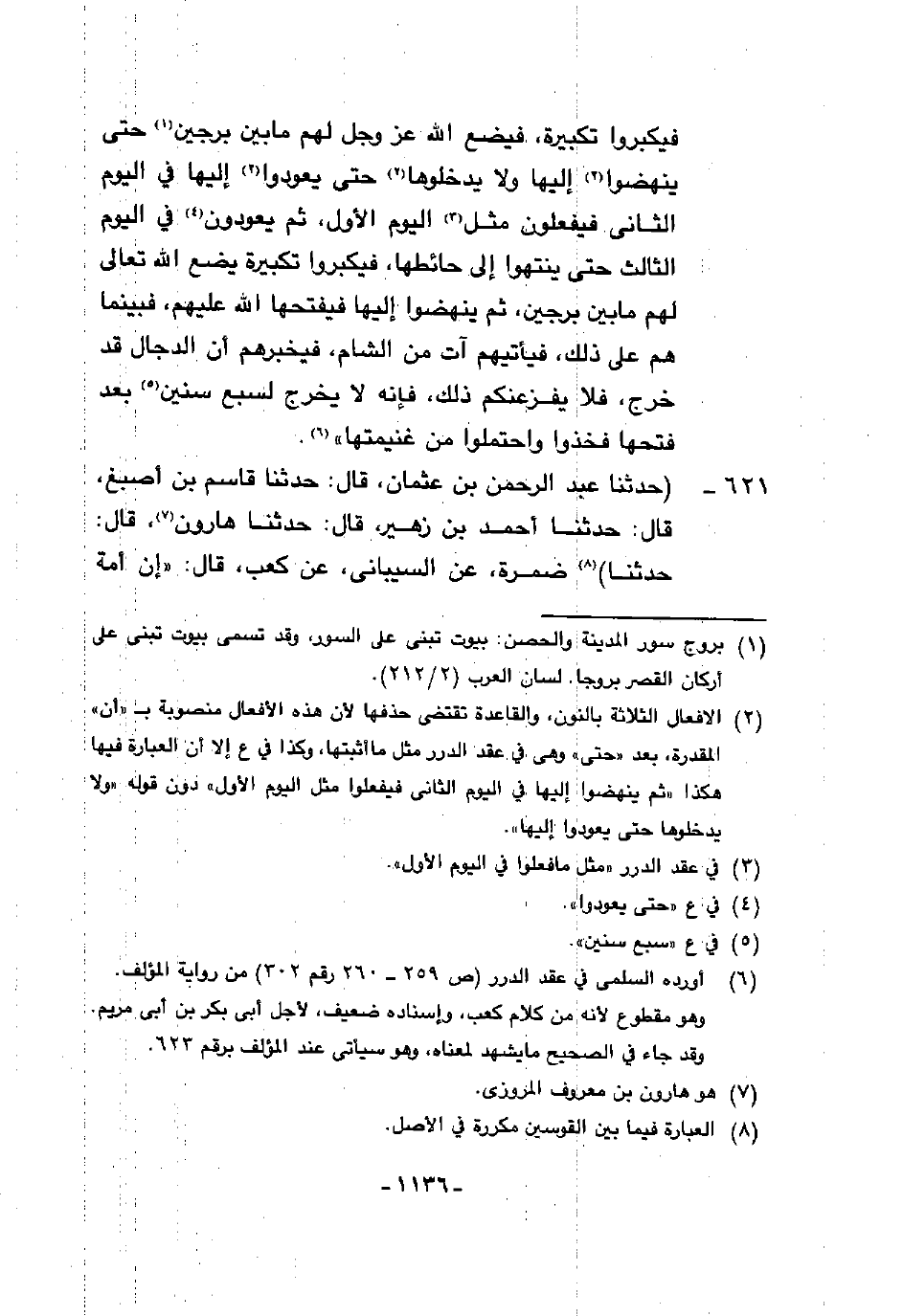 621 - حَدَّثَنَا عَبْدُ الرَّحْمَنِ بْنُ عُثْمَانَ، قَالَ: حَدَّثَنَا قَاسِمُ بْنُ أَصْبَغَ، قَالَ: حَدَّثَنَا أَحْمَدُ بْنُ زُهَيْرٍ، قَالَ: حَدَّثَنَا هَارُونُ، قَالَ: حَدَّثَنَا ضَمْرَةُ، عَنِ السَّيْبَانِيِّ، عَنْ كَعْبٍ، قَالَ: " إِنَّ §أُمَّةً -[1137]- تُدْعَى بِالنَّصْرَانِيَّةِ فِي بَعْضِ جَزَائِرِ الْبَحْرِ تُجَهِّزُ أَلْفَ مَرْكَبٍ فِي كُلِّ عَامٍ، فَيَقُولُونَ: ارْكَبُوا إِنْ شَاءَ اللَّهُ وَإِنْ لَمْ يَشَأْ، قَالَ: فَإِذَا وَقَعُوا فِي الْبَحْرِ بَعَثَ اللَّهُ عَزَّ وَجَلَّ عَلَيْهِمْ عَاصِفًا مِنَ الرِّيحِ كُسِرَتْ سُفُنُهُمْ، قَالَ: فَتَصْنَعُ ذَلِكَ مِرَارًا فَإِذَا أَرَادَ اللَّهُ تَعَالَى أَمْرًا اتَّخَذَتْ سُفُنًا لَمْ يُوضَعْ عَلَى ظَهْرِ الْبَحْرِ مِثْلُهَا قَطُّ ثُمَّ تَقُولُ: ارْكَبُوا إِنْ شَاءَ اللَّهُ، قَالَ: فَيَرْكَبُونَ فَيَمُرُّونَ بِالْقُسْطَنْطِينِيَّةِ، قَالَ: فَيَفْزَعُونَ لَهُمْ فَيَقُولُونَ: مَا أَنْتُمْ؟ فَيَقُولُونَ: نَحْنُ أُمَّةٌ تُدْعَى النَّصْرَانِيَّةُ نُرِيدُ هَذِهِ الْأُمَّةَ الَّتِي أَخْرَجْتَنَا عَنْ بِلَادِنَا وَبِلَادِ آبَائِنَا، قَالَ: فَيُمِدُّونَهُمْ سُفُنًا، قَالَ: فَيَنْتَهُونَ إِلَى عَكَّا فَيُخْرِجُونَ سُفُنَهُمْ وَيَحْرِقُونَهَا وَيَقُولُونَ: بِلَادُنَا وَبِلَادُ آبَائِنَا، قَالَ: وَأَمِيرُ الْمُسْلِمِينَ يَوْمَئِذٍ بِبَيْتِ الْمَقْدِسِ، فَيَبْعَثُ إِلَى مِصْرَ فَيَسْتَمِدُّهُمْ، وَيَبْعَثُ إِلَى الْعِرَاقِ فَيَسْتَمِدُّهُمْ، وَيَبْعَثُ إِلَى أَهْلِ -[1138]- الْيَمَنِ فَيَسْتَمِدُّهُمْ، قَالَ: فَيَجِيئُهُ رَسُولُهُ مِنْ قِبَلِ أَهْلِ مِصْرَ فَيَقُولُونَ: إِنَّا بِحَضْرَةِ بَحْرٍ، وَالْبَحْرُ حَمَّالٌ، فَلَا يُمِدُّونَهُ، وَيَأْتِيهِ رَسُولُهُ مِنْ قِبَلِ أَهْلِ الْعِرَاقِ فَيَقُولُونَ: نَحْنُ بِحَضْرَةِ بَحْرٍ، وَالْبَحْرُ حَمَّالٌ، فَلَا يُمِدُّونَهُ، قَالَ: فَيَمُرُّ الرَّسُولُ بِحِمْصَ وَقَدْ غَلَقَهَا أَهْلُهَا مِنَ الْعَجَمِ عَلَى مَنْ فِيهَا مِنَ الْمُسْلِمِينَ، فَيُخْبِرُ الرَّسُولُ بِذَلِكَ أَمِيرَ الْمُسْلِمِينَ، قَالَ: وَيُمِدُّهُ أَهْلُ الْيَمَنِ عَلَى قُلْصَانِهِمْ، قَالَ: وَيَكْتُمُ الْخَبَرَ وَيَقُولُ: أَيَّ شَيْءٍ نَنْتَظِرُ؟ الْآنَ يُغْلِقُ أَهْلُ كُلِّ مَدِينَةٍ عَلَى مَنْ فِيهَا مِنَ الْمُسْلِمِينَ، قَالَ: فَيَنْهَضُ إِلَيْهِمْ، فَيُقْتَلُ ثُلُثٌ مِنَ الْمُسْلِمِينَ وَيَأْخُذُ ثُلُثٌ بِأَذْنَابِ الْإِبِلِ وَيَلْحَقُونَ بِالْبَرَّيَّةِ وَيَهْلِكُونَ فِي -[1139]- مَهْبِلٍ مِنَ الْأَرْضِ، قَالَ: فَلَا إِلَى أَهْلِيهِمْ يَرْجِعُونَ وَلَا الْجَنَّةَ يَرَوْنَهَا قَالَ: وَيَفْتَحُ الثُّلُثُ فَيَتْبَعُونَهُمْ فِي جَبَلِ لُبْنَانَ حَتَّى يَنْتَهِيَ أَمِيرُ الْمُسْلِمِينَ إِلَى الْخَلِيجِ وَيَصِيرُ الْأَمْرُ إِلَى مَا كَانَ النَّاسُ عَلَيْهِ، الْوَالِي يَحْمِلُ الرَّايَةَ فَيَرْكُزُ لِوَاءَهُ وَيَأْتِي الْمَاءَ لِيَتَوَضَّأَ مِنْهُ لِصَلَاةِ الصُّبْحِ، قَالَ: فَيَتَبَاعَدُ الْمَاءُ مِنْهُ، قَالَ: فَيَتْبَعُهُ فَيَتَبَاعَدُ مِنْهُ، فَإِذَا رَأَى ذَلِكَ أَخَذَ لِوَاءَهُ وَاتَّبَعَ الْمَاءَ حَتَّى يَجُوزَ مِنْ تِلْكَ النَّاحِيَةِ ثُمَّ يَرْكُزُهُ ثُمَّ يُنَادِي: أَيُّهَا النَّاسُ أَجِيزُوا فَإِنَّ اللَّهَ قَدْ فَرَقَ لَكُمُ الْبَحْرَ كَمَا فَرَقَهُ لِبَنِي إِسْرَائِيلَ، قَالَ: فَيَجُوزُ النَّاسُ، قَالَ: فَيَسْتَقْبِلُ الْقُسْطَنْطِينِيَّةَ، قَالَ: فَيُكَبِّرُونَ فَيَهْتَزُّ حَائِطُهَا، ثُمَّ يُكَبِّرُونَ فَيَهْتَزُّ، ثُمَّ يُكَبِّرُونَ فَيَسْقُطُ مِنْهَا مَا بَيْنَ اثْنَىْ عَشَرَ بُرْجًا، قَالَ: فَيَدْخُلُونَهَا فَيَجِدُونَ فِيهَا ثَلَاثَةَ كُنُوزٍ مِنْ ذَهَبٍ وَفِضَّةٍ وَكَنْزٍ مِنْ نُح