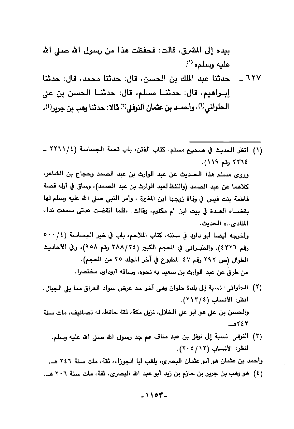 627 - حَدَّثَنَا عَبْدُ الْمَلِكِ بْنُ الْحَسَنِ، قَالَ: حَدَّثَنَا مُحَمَّدٌ، قَالَ: حَدَّثَنَا إِبْرَاهِيمُ، قَالَ: حَدَّثَنَا مُسْلِمٌ، قَالَ: حَدَّثَنَا الْحَسَنُ بْنُ عَلِيٍّ الْحُلْوَانِيُّ، وَأَحْمَدُ بْنُ عُثْمَانَ النَّوْفَلِيُّ، قَالَا: حَدَّثَنَا وَهْبُ بْنُ جَرِيرٍ -[1154]-، قَالَ: حَدَّثَنَا أَبِي قَالَ: سَمِعْتُ غَيْلَانَ بْنَ جَرِيرٍ، يُحَدِّثُ، عَنِ الشَّعْبِيِّ، عَنْ فَاطِمَةَ بِنْتِ قَيْسٍ، قَالَتْ: قَدِمَ عَلَى رَسُولِ اللَّهِ صَلَّى اللهُ عَلَيْهِ وَسَلَّمَ تَمِيمٌ الدَّارِيُّ فَأَخْبَرَ رَسُولَ اللَّهِ صَلَّى اللهُ عَلَيْهِ وَسَلَّمَ أَنَّهُ رَكِبَ الْبَحْرَ فَتَاهَتْ بِهِ سَفِينَتُهُ فَسَقَطَ إِلَى جَزِيرَةٍ فَخَرَجَ إِلَيْهَا يَلْتَمِسُ الْمَاءَ فَلَقِيَ إِنْسَانًا يَجُرُّ شَعْرَهُ وَاقْتَصَّ الْحَدِيثَ وَقَالَ فِيهِ: ثُمَّ قَالَ: أَمَا إِنَّهُ لَوْ قَدْ أُذِنَ لِي فِي الْخُرُوجِ قَدْ وَطِئْتُ الْبِلَادَ كُلَّهَا غَيْرَ طَيْبَةَ فَأَخْرَجَهُ رَسُولُ اللَّهِ صَلَّى اللهُ عَلَيْهِ وَسَلَّمَ إِلَى النَّاسِ فَحَدَّثَهُمْ، قَالَ: §«هَذِهِ طَيْبَةُ وَذَاكَ الدَّجَّالُ»