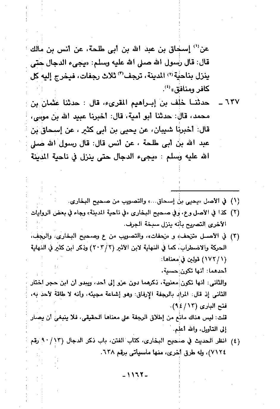 637 - حَدَّثَنَا خَلَفُ بْنُ إِبْرَاهِيمَ الْمُقْرِئُ، قَالَ: حَدَّثَنَا عُثْمَانُ بْنُ مُحَمَّدٍ، قَالَ: حَدَّثَنَا أَبُو أُمَيَّةَ، قَالَ: أَخْبَرَنَا عُبَيْدُ اللَّهِ بْنُ مُوسَى، قَالَ: أَخْبَرَنَا شَيْبَانُ، عَنْ يَحْيَى بْنِ أَبِي كَثِيرٍ، عَنْ إِسْحَاقَ بْنِ عَبْدِ اللَّهِ بْنِ أَبِي طَلْحَةَ، عَنْ أَنَسٍ، قَالَ: قَالَ رَسُولُ اللَّهِ صَلَّى اللهُ عَلَيْهِ وَسَلَّمَ: §«يَجِيءُ الدَّجَّالُ حَتَّى يَنْزِلَ فِي نَاحِيَةِ الْمَدِينَةِ -[1163]- فَتَرْجُفُ ثَلَاثَ رَجَفَاتٍ فَيَخْرُجُ إِلَيْهِ كُلُّ كَافِرٍ وَمُنَافِقٍ»