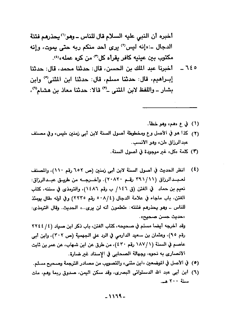 645 - أَخْبَرَنَا عَبْدُ الْمَلِكِ بْنُ الْحَسَنِ، قَالَ: حَدَّثَنَا مُحَمَّدٌ، قَالَ: حَدَّثَنَا إِبْرَاهِيمُ، قَالَ: حَدَّثَنَا مُسْلِمٌ، قَالَ: حَدَّثَنَا ابْنُ الْمُثَنَّى، وَابْنُ بَشَّارٍ وَاللَّفْظُ لِابْنِ الْمُثَنَّى قَالَا: حَدَّثَنَا مُعَاذُ بْنُ هِشَامٍ -[1170]-، قَالَ، حَدَّثَنِي أَبِي، عَنْ قَتَادَةَ، قَالَ: حَدَّثَنَا أَنَسُ بْنُ مَالِكٍ، أَنَّ النَّبِيَّ صَلَّى اللهُ عَلَيْهِ وَسَلَّمَ، قَالَ: §«الدَّجَّالُ مَكْتُوبٌ بَيْنَ عَيْنَيْهِ ك ف ر أَيْ كَافِرٌ»