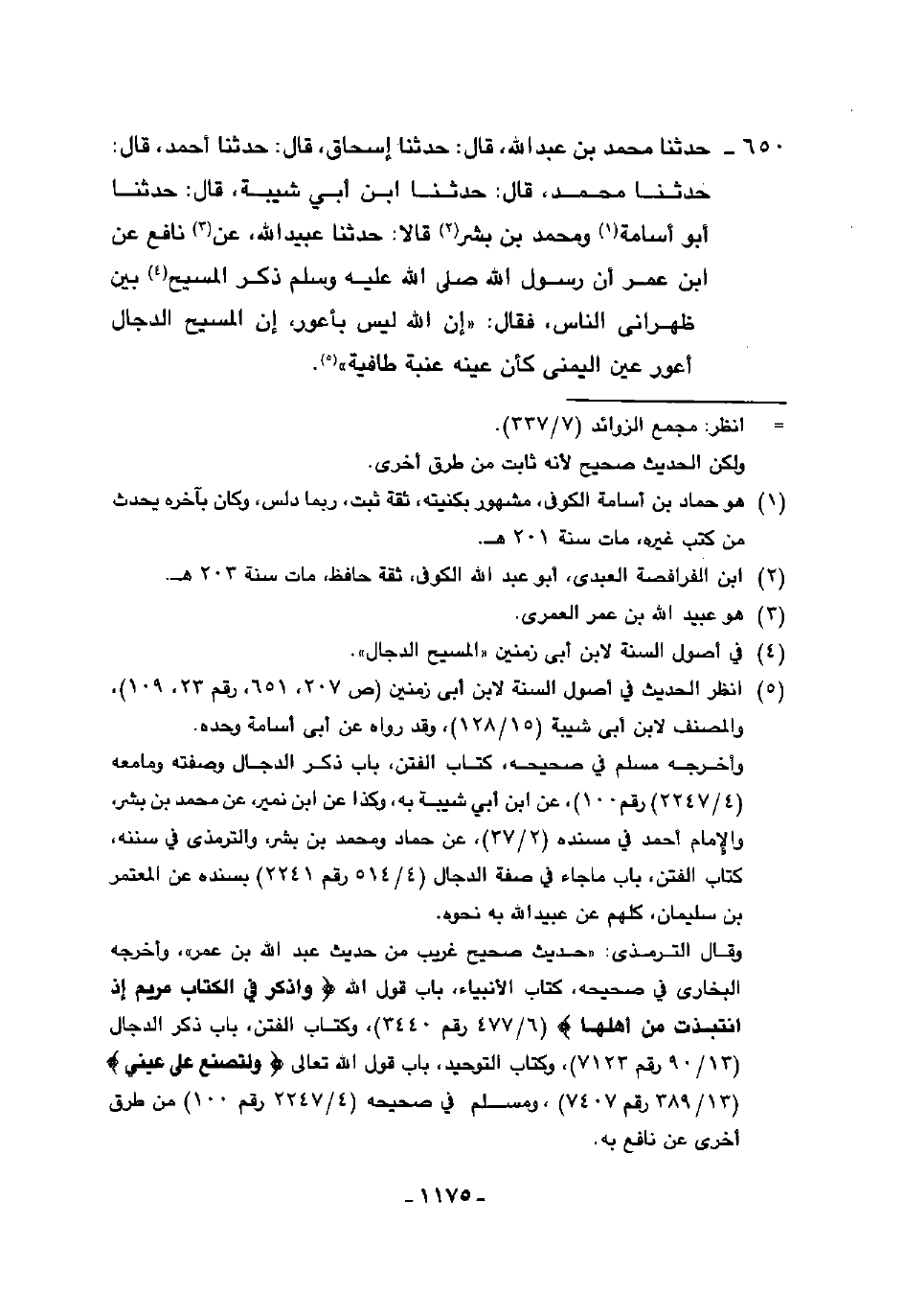 650 - حَدَّثَنَا مُحَمَّدُ بْنُ عَبْدِ اللَّهِ، قَالَ: حَدَّثَنَا إِسْحَاقُ، قَالَ: حَدَّثَنَا أَحْمَدُ، قَالَ: حَدَّثَنَا مُحَمَّدٌ، قَالَ: حَدَّثَنَا ابْنُ أَبِي شَيْبَةَ، قَالَ: حَدَّثَنَا أَبُو أُسَامَةَ، وَمُحَمَّدُ بْنُ بِشْرٍ، قَالَا: حَدَّثَنَا عُبَيْدُ اللَّهِ، عَنْ نَافِعٍ، عَنِ ابْنِ عُمَرَ، أَنَّ رَسُولَ اللَّهِ صَلَّى اللهُ عَلَيْهِ وَسَلَّمَ ذَكَرَ الْمَسِيحَ بَيْنَ ظَهْرَانَيِ النَّاسِ، فَقَالَ: «إِنَّ اللَّهَ لَيْسَ بِأَعْوَرَ إِنَّ §الْمَسِيحَ الدَّجَّالَ أَعْوَرُ عَيْنُ الْيُمْنَى كَأَنَّ عَيْنَهُ عِنَبَةٌ طَافِيَةٌ»