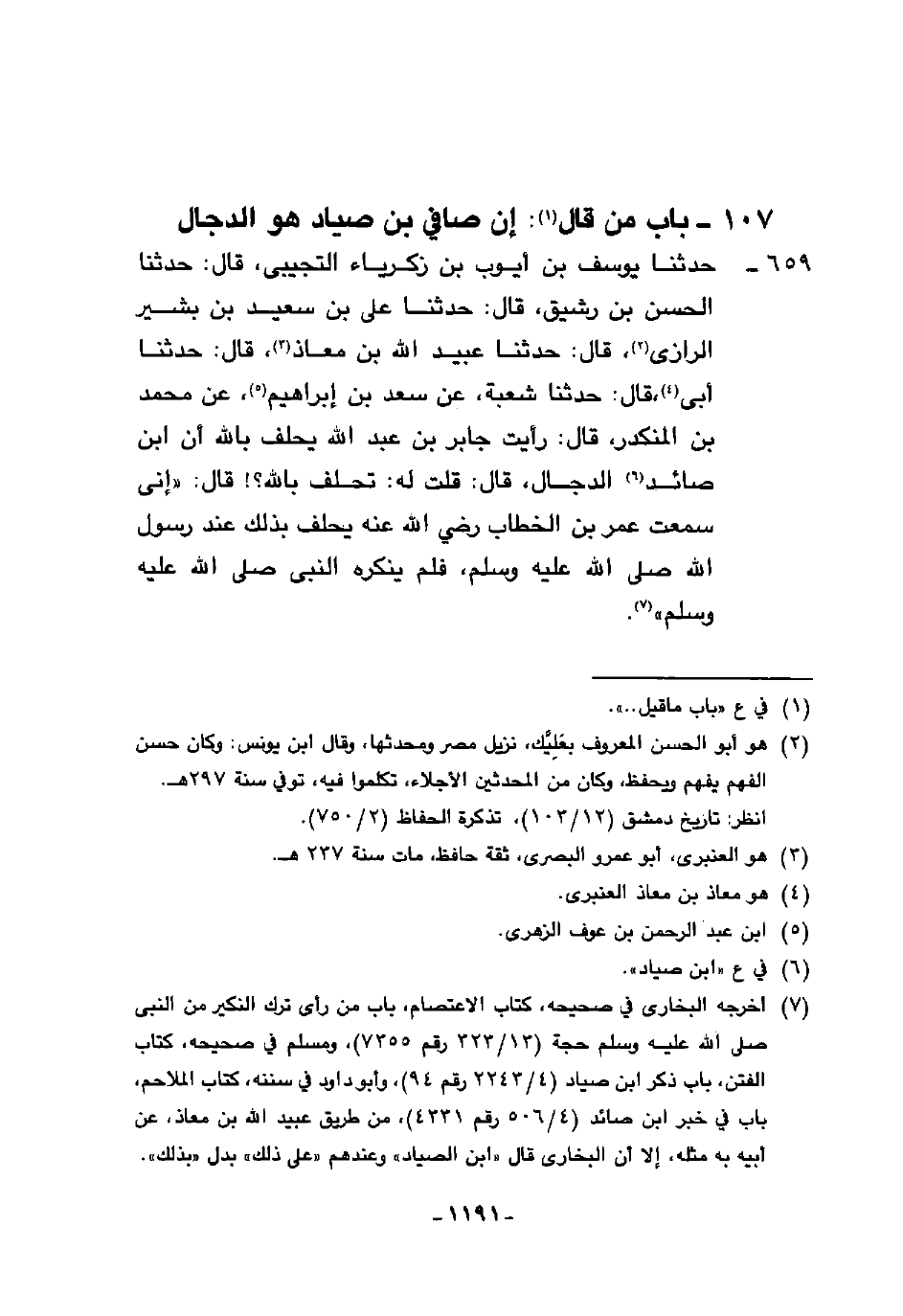 659 - حَدَّثَنَا يُوسُفُ بْنُ أَيُّوبَ بْنِ زَكَرِيَّاءَ التُّجِيبِيُّ، قَالَ: حَدَّثَنَا الْحَسَنُ بْنُ رَشِيقٍ، قَالَ: حَدَّثَنَا عَلِيُّ بْنُ سَعِيدِ بْنِ بَشِيرٍ الرَّازِيُّ، قَالَ: حَدَّثَنَا عُبَيْدُ اللَّهِ بْنُ مُعَاذٍ، قَالَ: حَدَّثَنَا أَبِي قَالَ: حَدَّثَنَا شُعْبَةُ، عَنْ سَعْدِ بْنِ إِبْرَاهِيمَ، عَنْ مُحَمَّدِ بْنِ الْمُنْكَدِرِ، قَالَ: «رَأَيْتُ جَابِرَ بْنَ عَبْدِ اللَّهِ يَحْلِفُ بِاللَّهِ أَنَّ §ابْنَ صَائِدٍ الدَّجَّالُ» ، قَالَ: قُلْتُ لَهُ: تَحْلِفُ بِاللَّهِ؟ قَالَ: إِنِّي سَمِعْتُ عُمَرَ بْنَ الْخَطَّابِ رَضِيَ اللَّهُ عَنْهُ يَحْلِفُ بِذَلِكَ عِنْدَ رَسُولِ اللَّهِ صَلَّى اللهُ عَلَيْهِ وَسَلَّمَ فَلَمْ يُنْكِرْهُ النَّبِيُّ صَلَّى اللهُ عَلَيْهِ وَسَلَّمَ