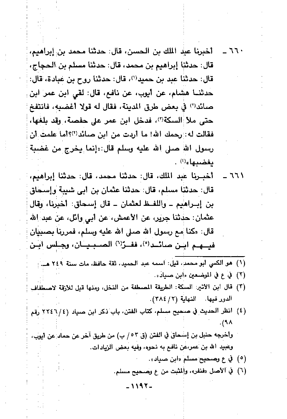 660 - أَخْبَرَنَا عَبْدُ الْمَلِكِ بْنُ الْحَسَنِ، قَالَ: حَدَّثَنَا مُحَمَّدُ بْنُ إِبْرَاهِيمَ، قَالَ: حَدَّثَنَا إِبْرَاهِيمُ بْنُ مُحَمَّدٍ، قَالَ: حَدَّثَنَا مُسْلِمُ بْنُ الْحَجَّاجِ، قَالَ: حَدَّثَنَا عَبْدُ بْنُ حُمَيْدٍ، قَالَ: حَدَّثَنَا رَوْحُ بْنُ عُبَادَةَ، قَالَ: حَدَّثَنَا هِشَامٌ، عَنْ أَيُّوبَ، عَنْ نَافِعٍ، قَالَ: لَقِيَ ابْنُ عُمَرَ ابْنَ صَائِدٍ فِي بَعْضِ طُرُقِ الْمَدِينَةِ، فَقَالَ لَهُ قَوْلًا أَغْضَبَهُ فَانْتَفَخَ حَتَّى مَلَأَ السِّكَّةَ، فَدَخَلَ ابْنُ عُمَرَ عَلَى حَفْصَةَ وَقَدْ بَلَغَهَا فَقَالَتْ لَهُ: رَحِمَكَ اللَّهُ مَا أَرَدْتَ مِنَ ابْنِ صَائِدٍ؟ أَمَا عَلِمْتَ أَنَّ رَسُولَ اللَّهِ صَلَّى اللهُ عَلَيْهِ وَسَلَّمَ، قَالَ: «إِنَّمَا §يَخْرُجُ مِنْ غَضْبَةٍ يَغْضَبُهَا»
